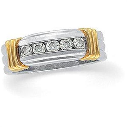 This beautiful Gents PLATINUM WEDDING BAND features a row of 5 SPARKLING DIAMONDS with a Total Weight = .50 CARATS! There are 18K Yellow Gold accents each side of the Diamonds. This Handsome Platinum ring is a size 10. (I have a matching womens band available)