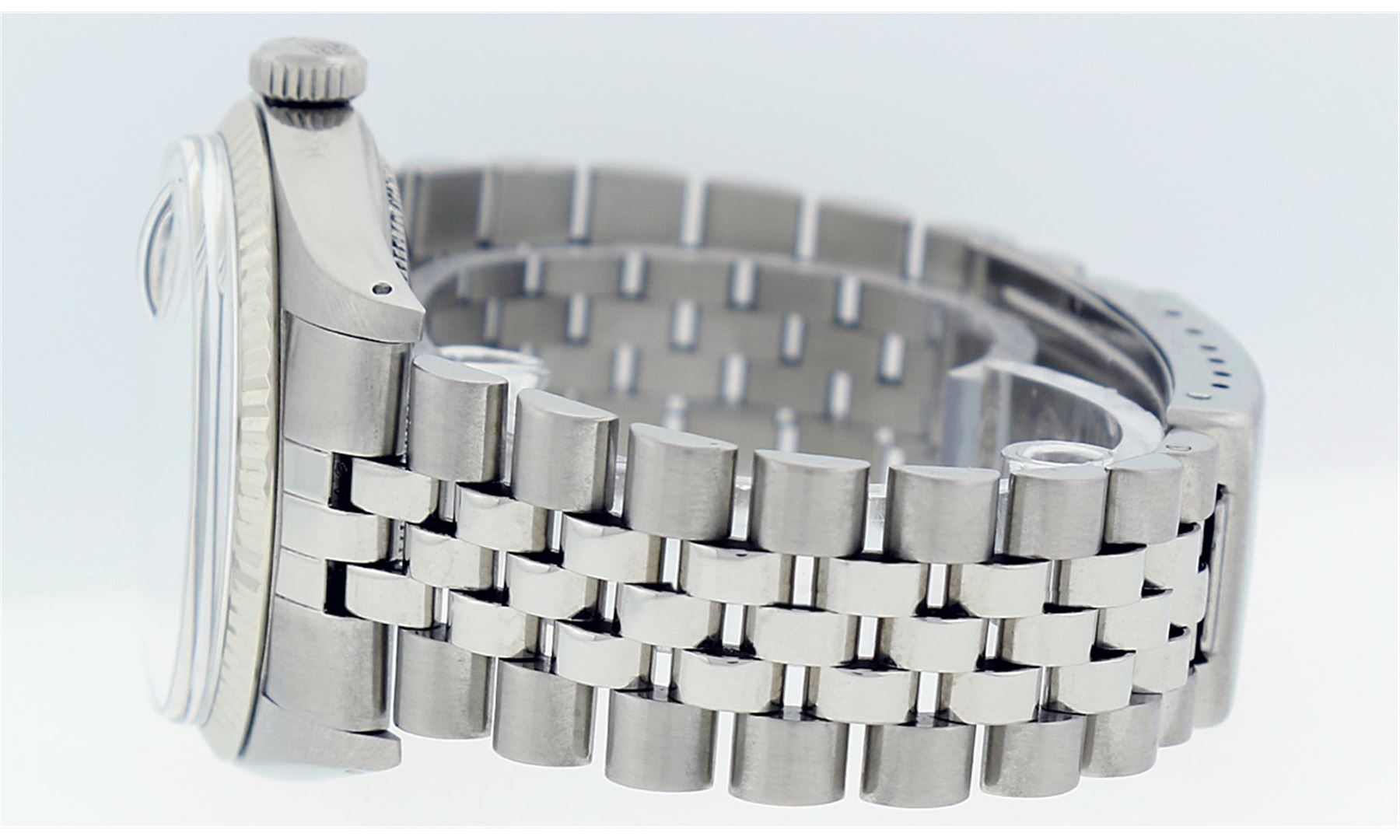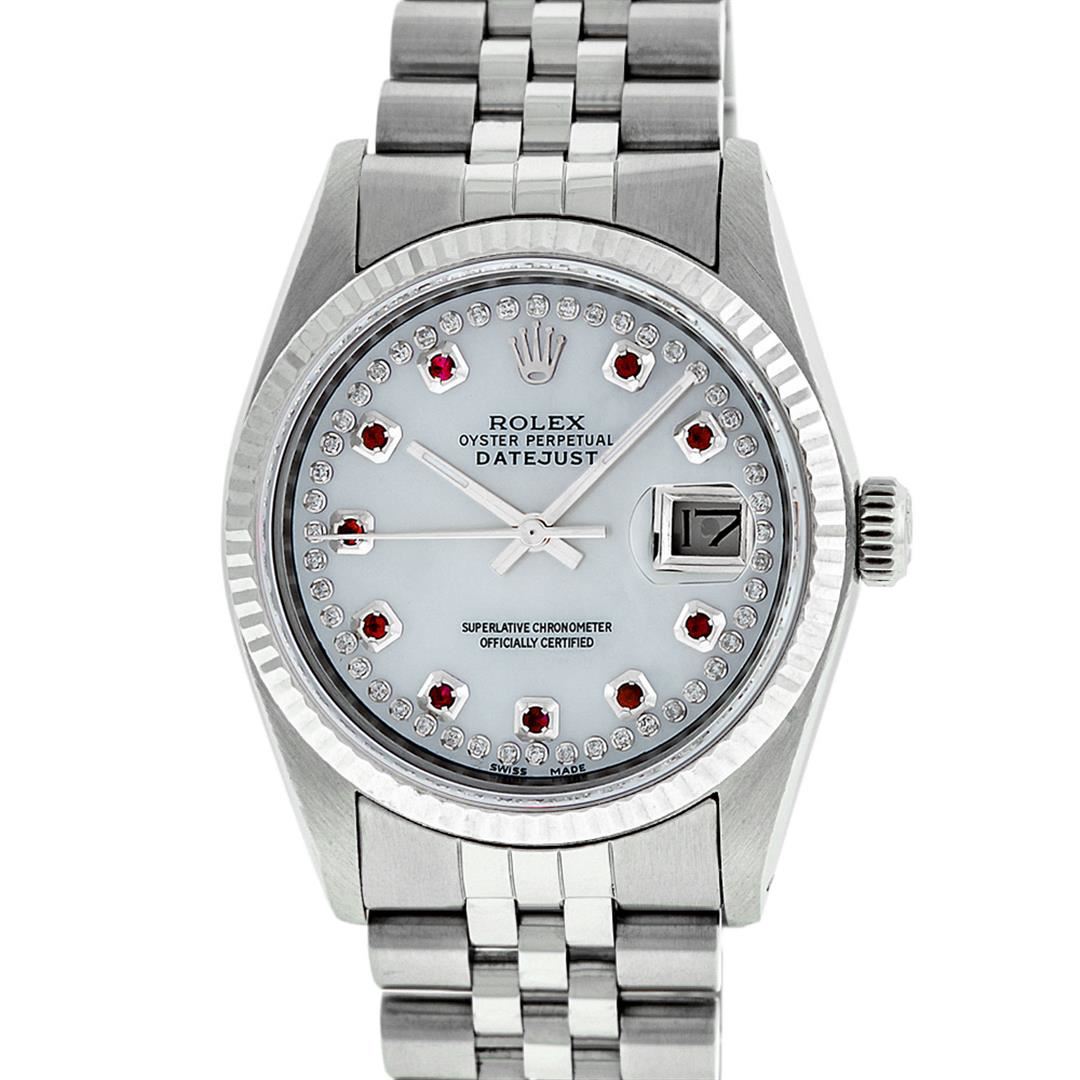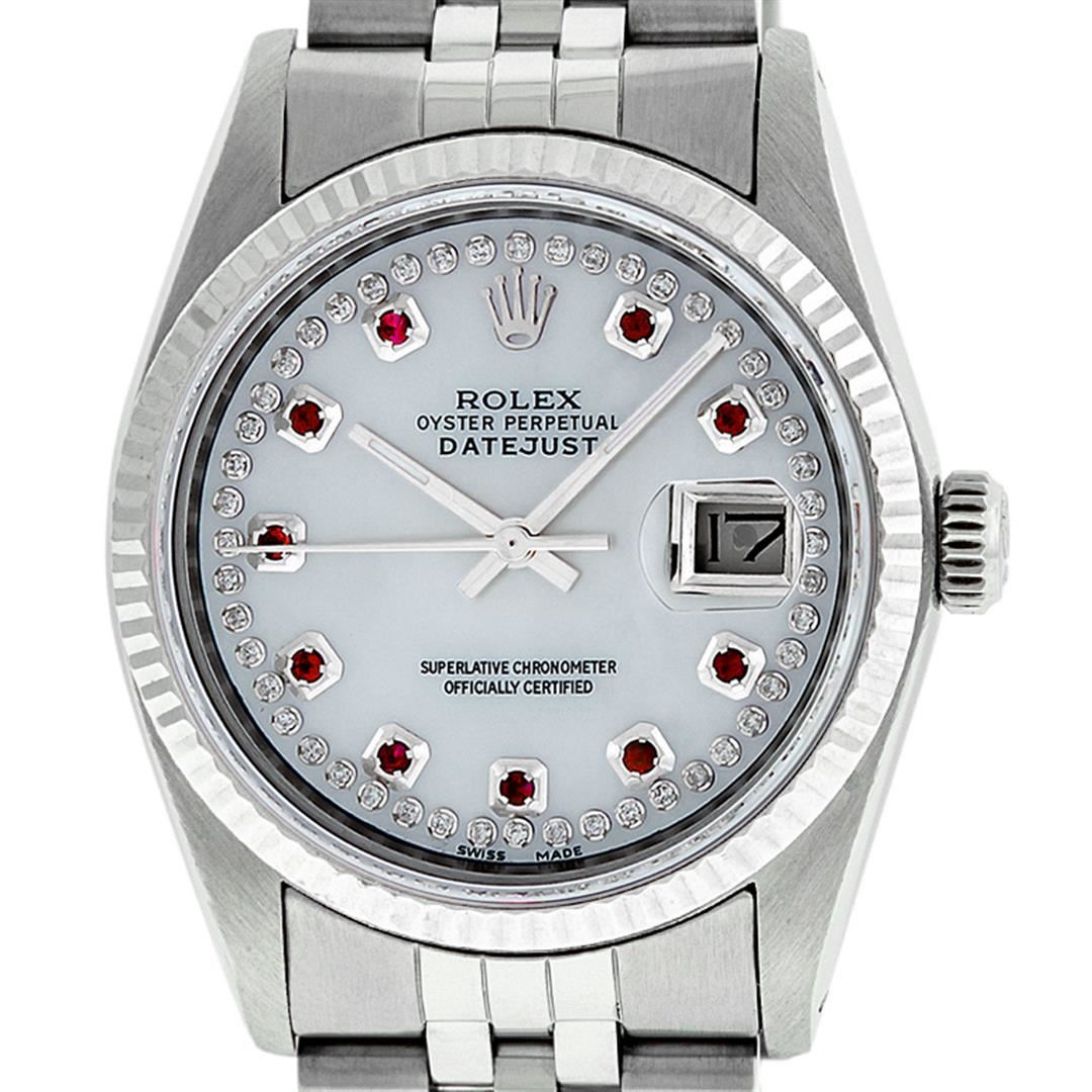 One Gents Rolex Datejust Polished Bright with Satin Finish, Serviced & Electronically Tested, Stainless Steel Case:36mm, Stainless Steel Crown, Bezel: 14K White Gold Fluted Bezel. Custom Crystal: Acrylic Cyclops Lens. Movement: Automatic Winding Movement Caliber 3035. Custom Dial: Mother Of Pearl Ruby String Diamond Dial, Stone Count: 10 Rubies + 48 Diamond in Dial G To H In Color, Si-VS Clarity. Date Window: 3 O'Clock Position Date Display, Quickset, Model: Datejust, Condition: G-6 Extra Fine. Bracelet:Stainless Steel Jubilee. Bright Polish & Satin Finish. 7.0 Inch Length, Adjustable. Standard Clasp, With Rolex Logo.