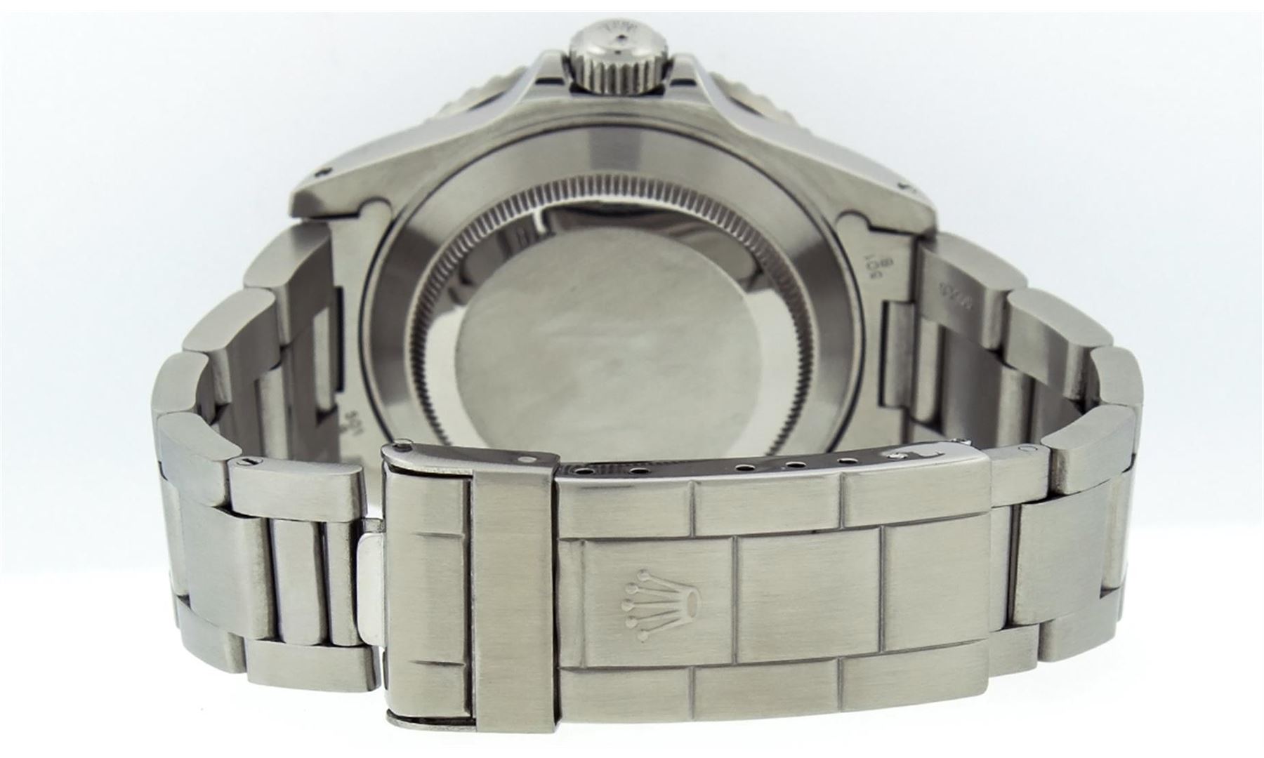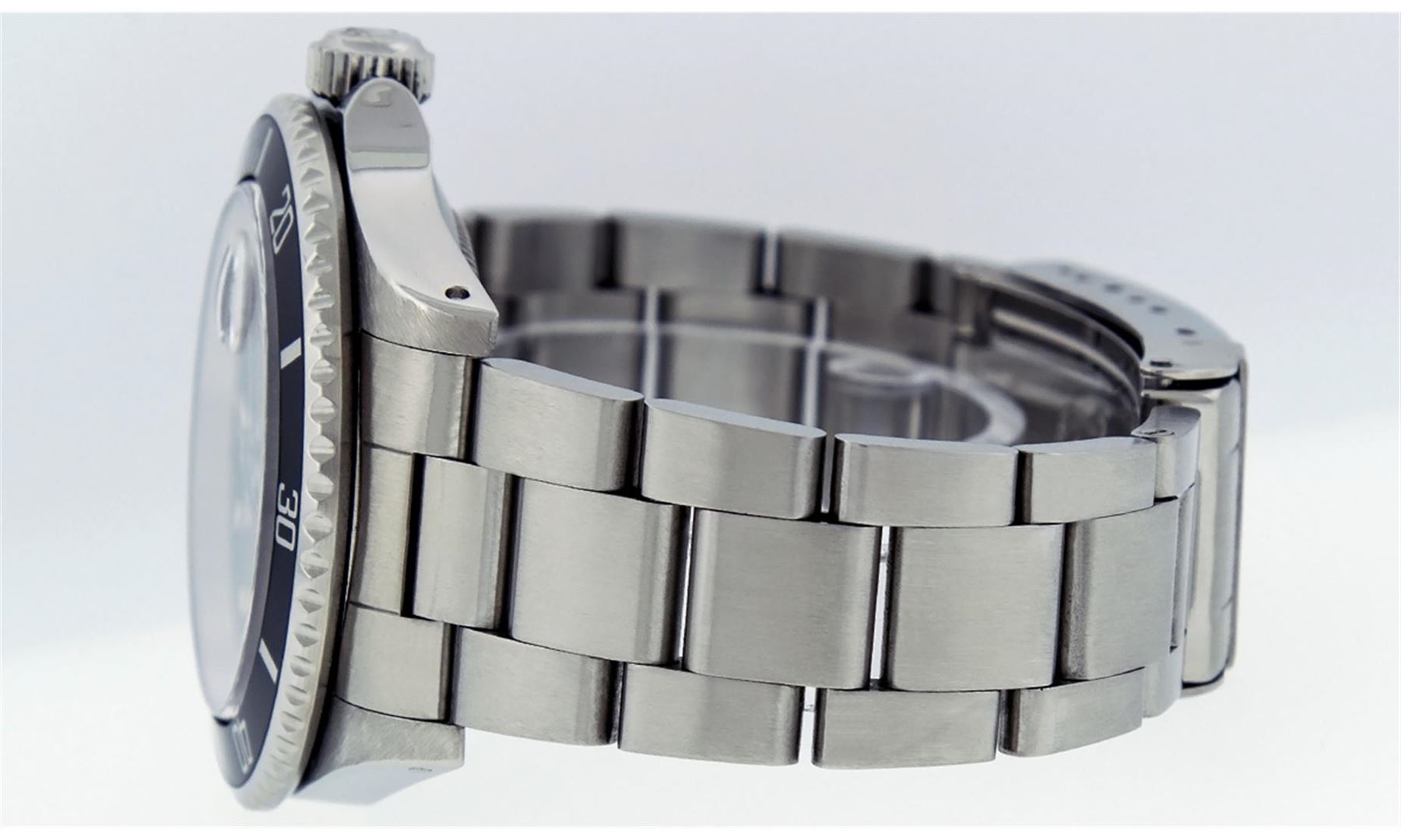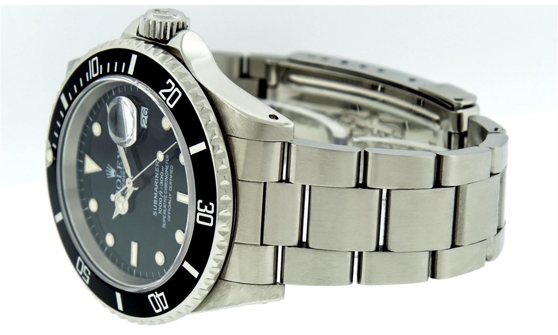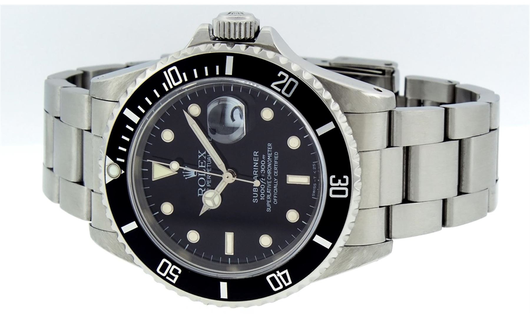One Mens Rolex Submariner With Date Polished, Serviced & Electronically Tested, Stainless Steel Case:41mm, Stainless Steel Crown, Bezel: Stainless Steel Rotatable Bezel With Black Insert. Crystal: Synthetic Sapphire Cyclops Lens. Movement: Automatic Winding Movement Caliber 3135. Dial: Black Submariner Dial. Date Window: 3 O'Clock Position Date Display, Model: Submariner 16610, Quickset, Condition: G-6 Extra Fine. Bracelet:Stainless Steel Oyster. Bright Polish & Satin Finish. 7.0 Inch Length, Adjustable. Standard Clasp, With Rolex Logo.