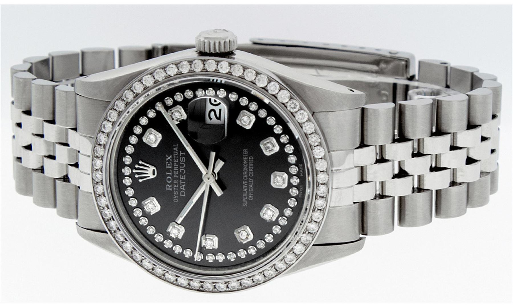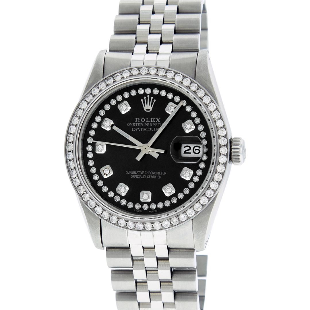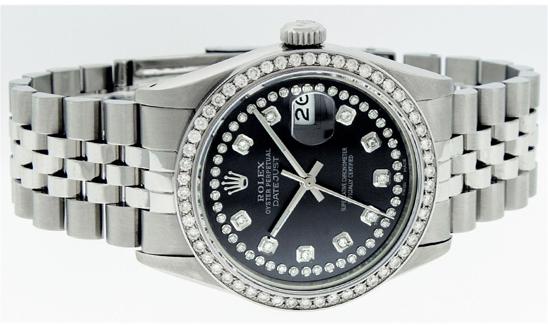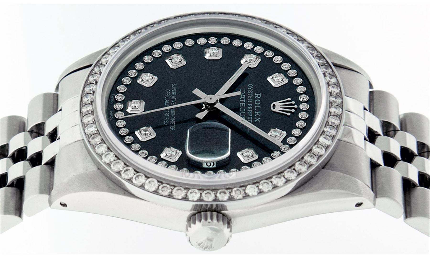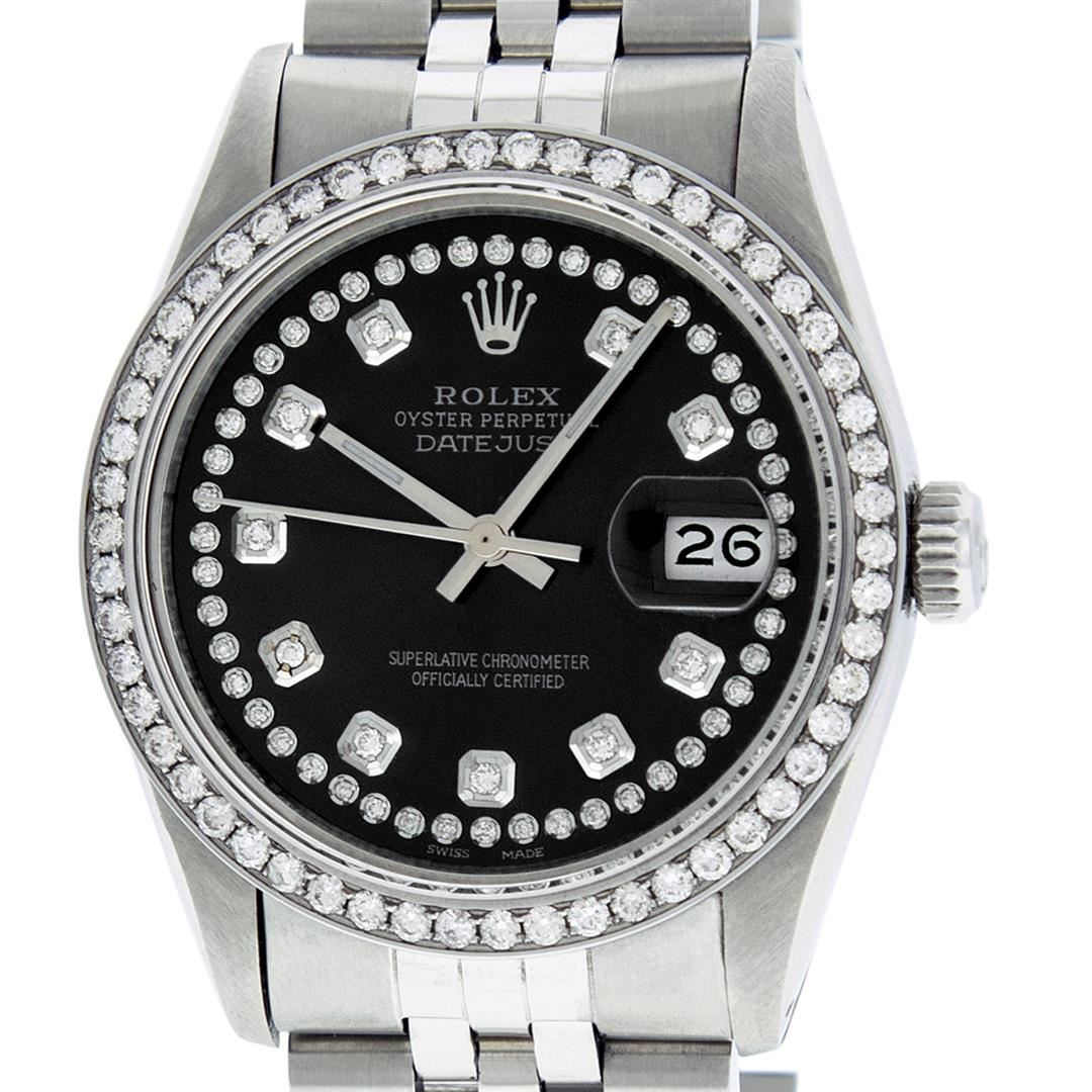 One Mens Rolex Datejust Polished Bright with Satin Finish, Serviced & Electronically Tested, Stainless Steel Case:36mm, Stainless Steel Crown, Custom Bezel: Stainless Steel Beadset Diamond Bezel, Diamond Count: 54 Diamonds Total Weight 1.00 Carat, Clarity: SI-VS, Color: G to H. Custom Crystal: Synthetic Sapphire Cyclops Lens. Movement: Automatic Winding Movement Caliber 3035. Custom Dial: Black String Diamond Dial, Diamond Count: 58 Diamonds In Dial, Color: G to H, Clarity: VS2-SI1. Date Window: 3 O'Clock Position Date Display, Quickset, Model: Datejust. Condition: G-6 Extra Fine. Bracelet:Stainless Steel Jubilee Band. Bright Polish & Satin Finish. 7.0 Inch Length, Adjustable. Standard Clasp, With Rolex Logo. This watch has been serviced time tested and is in excellent condition it is free of all scratches and dents.