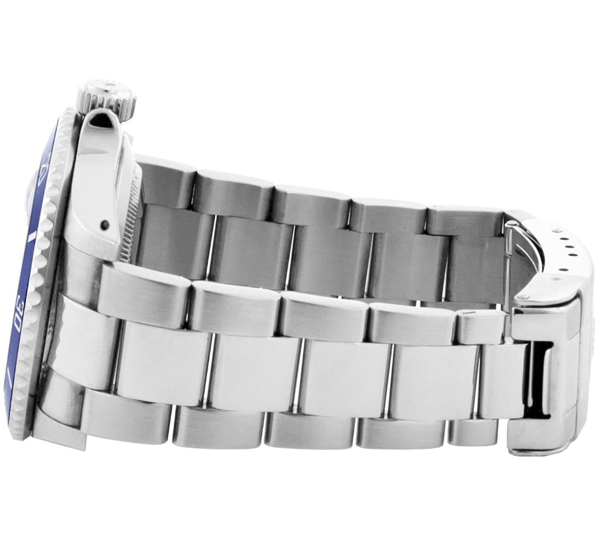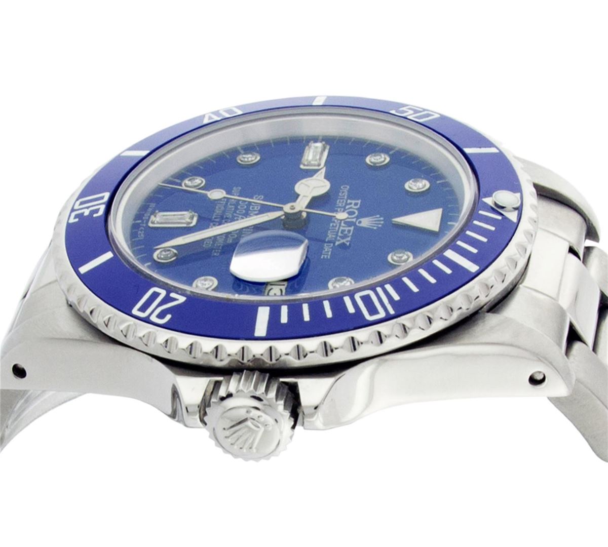 One Mens Rolex Submariner With Date Polished, Serviced & Electronically Tested, Stainless Steel Case:41mm, Stainless Steel Crown, Custom Bezel: Stainless Steel Rotatable Bezel With Blue Insert. Crystal: Synthetic Sapphire Cyclops Lens. Movement: Automatic Winding Movement Caliber 3035. Custom Dial: Blue Submariner Diamond Dial, Diamond Count: 8 Diamonds + 2 Baguette Diamonds, Color: G To H, Clairty: SI-VS. Date Window: 3 O'Clock Position Date Display, Model: Submariner 16800, Condition: G-6 Extra Fine. Bracelet:Stainless Steel Oyster. Bright Polish & Satin Finish. 6.75 Inch Length, Adjustable. Standard Clasp, With Rolex Logo.