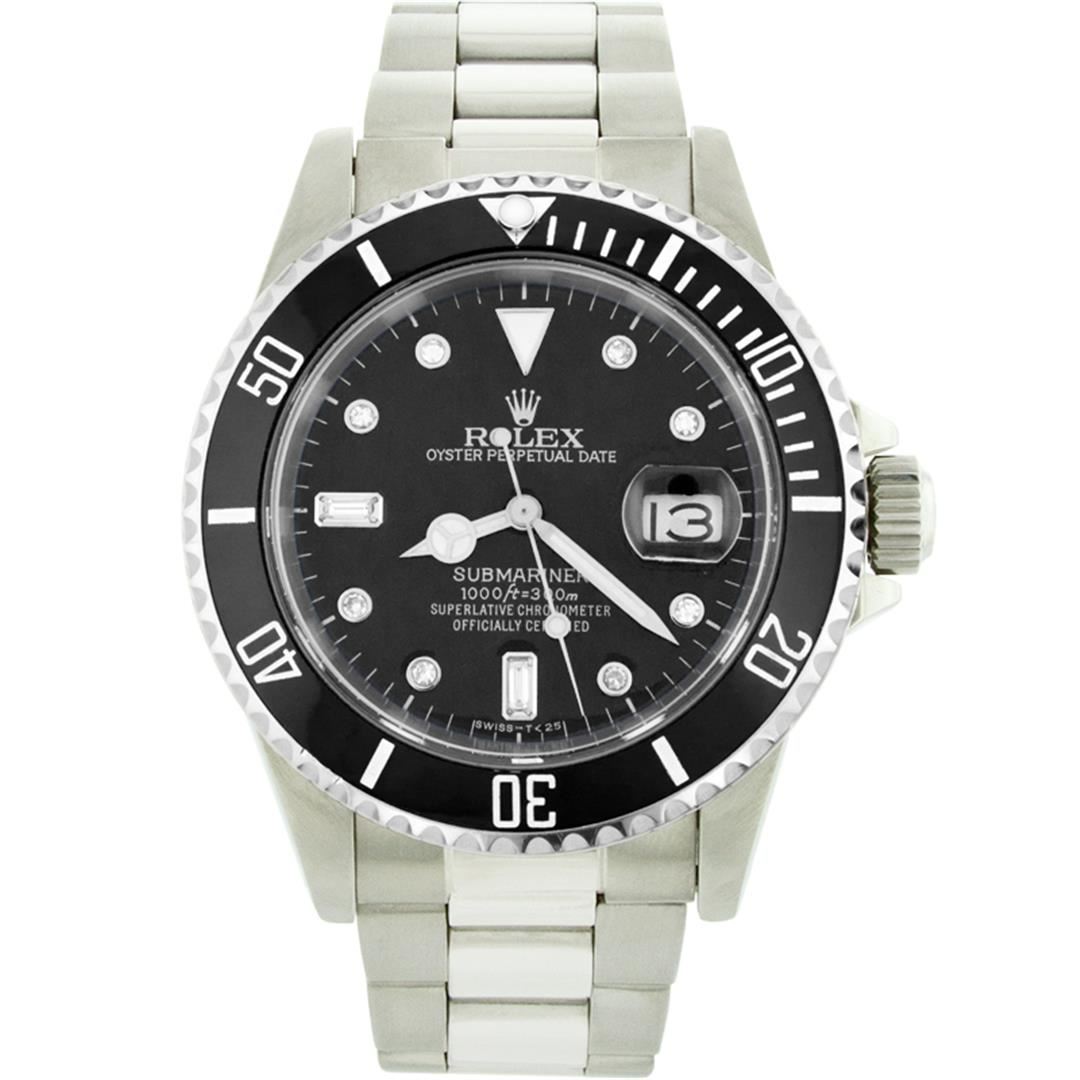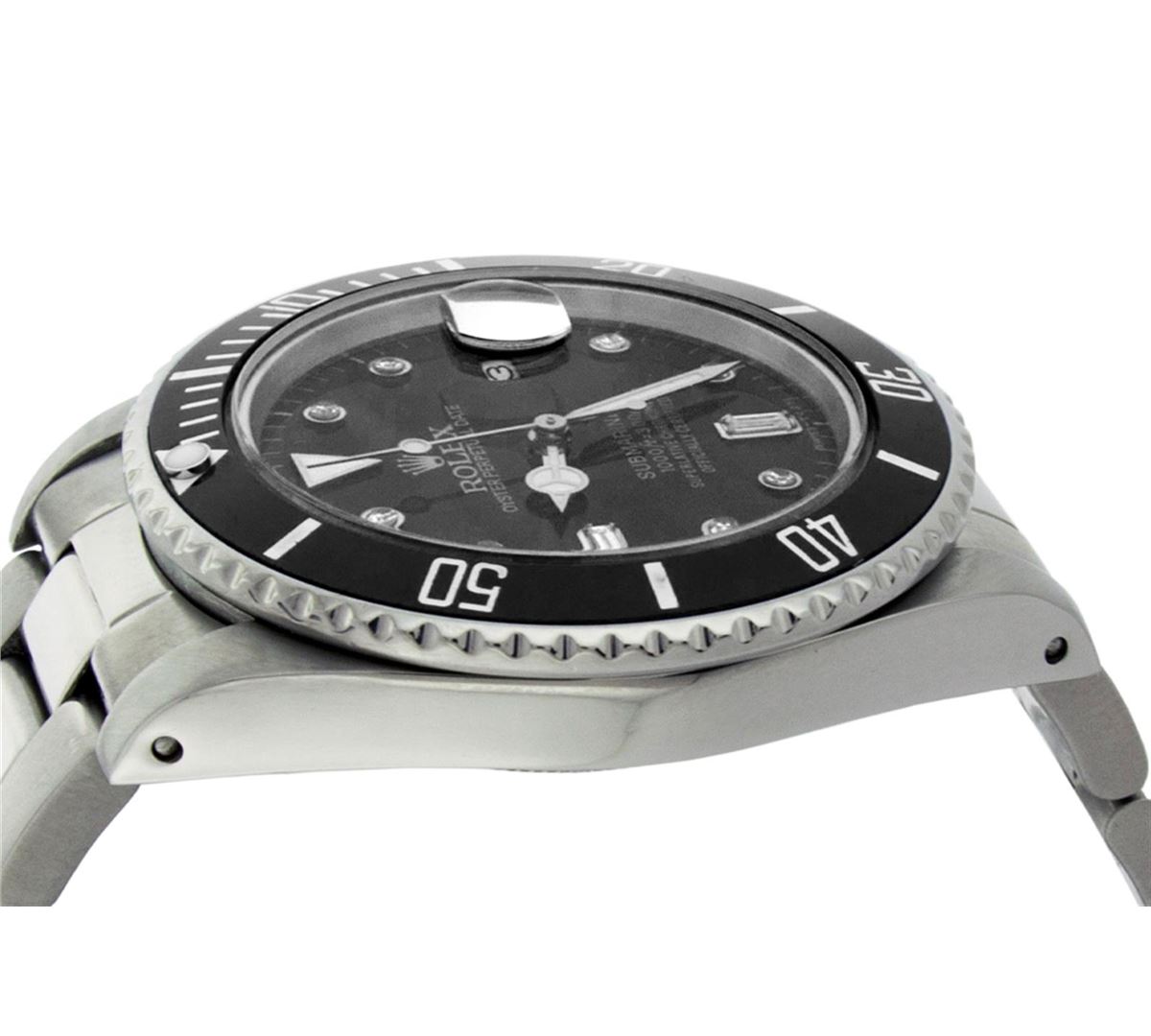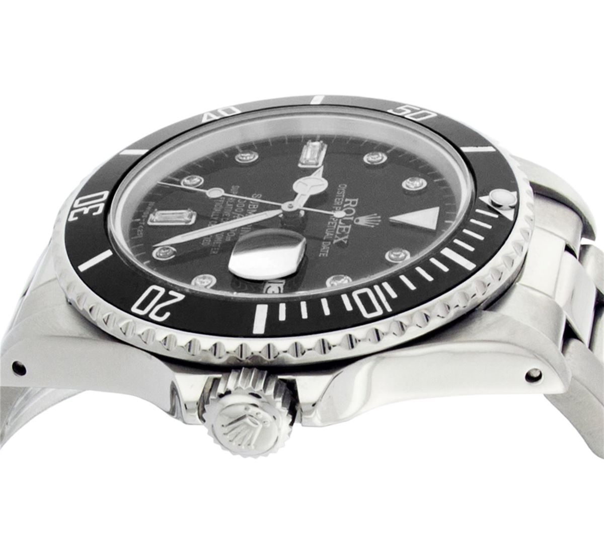 One Mens Rolex Submariner With Date Polished, Serviced & Electronically Tested, Stainless Steel Case:41mm, Stainless Steel Crown, Bezel: Stainless Steel Rotatable Bezel With Black Insert. Crystal: Synthetic Sapphire Cyclops Lens. Movement: Automatic Winding Movement Caliber 3035. Custom Dial: Black Submariner Diamond Dial, Diamond Count: 8 Diamonds + 2 Baguette Diamonds, Color: G To H, Clairty: SI-VS. Date Window: 3 O'Clock Position Date Display, Model: Submariner 16800, Quickset Condition: G-6 Extra Fine. Bracelet:Stainless Steel Oyster. Bright Polish & Satin Finish. 6.75 Inch Length, Adjustable. Standard Clasp, With Rolex Logo.