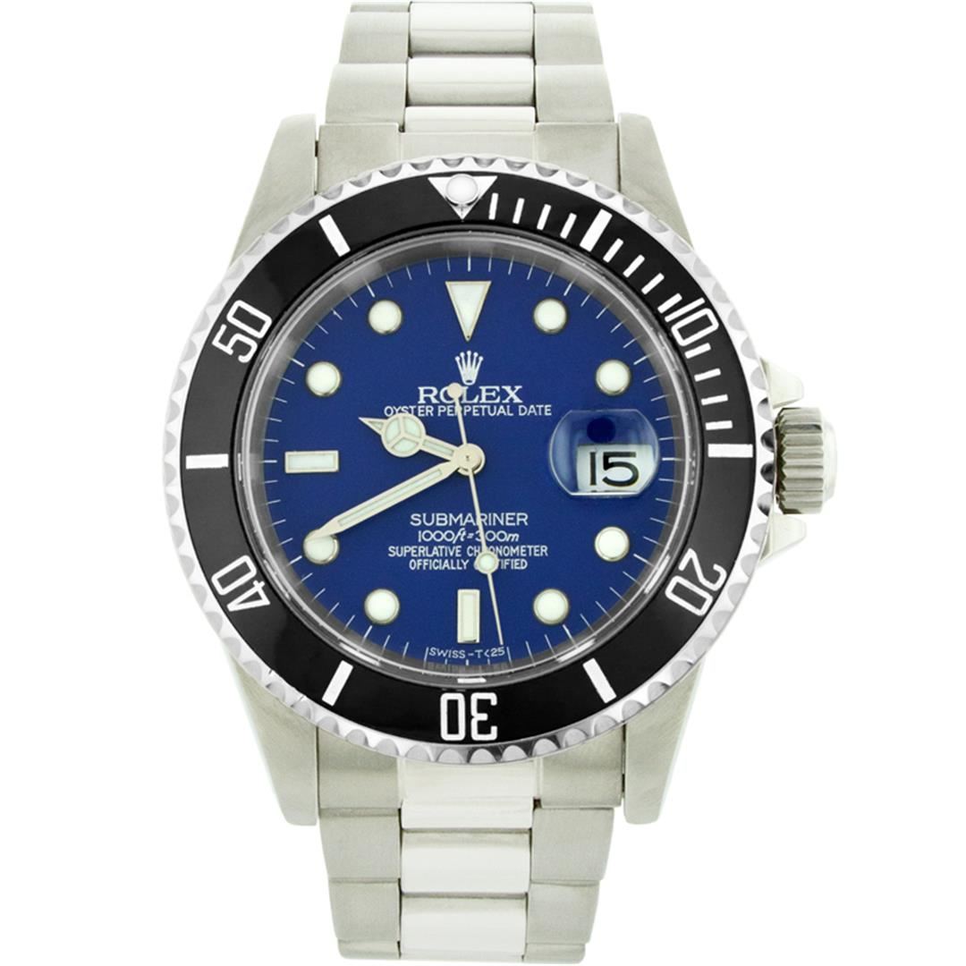 One Mens Rolex Submariner With Date Polished, Serviced & Electronically Tested, Stainless Steel Case:41mm, Stainless Steel Crown, Bezel: Stainless Steel Rotatable Bezel With Black Insert. Crystal: Synthetic Sapphire Cyclops Lens. Movement: Automatic Winding Movement Caliber 3035. Custom Dial: Blue Submariner Dial. Date Window: 3 O'Clock Position Date Display, Model: Submariner 16800, Quickset, Condition: G-6 Extra Fine. Bracelet:Stainless Steel Oyster. Bright Polish & Satin Finish. 6.75 Inch Length, Adjustable. Standard Clasp, With Rolex Logo.