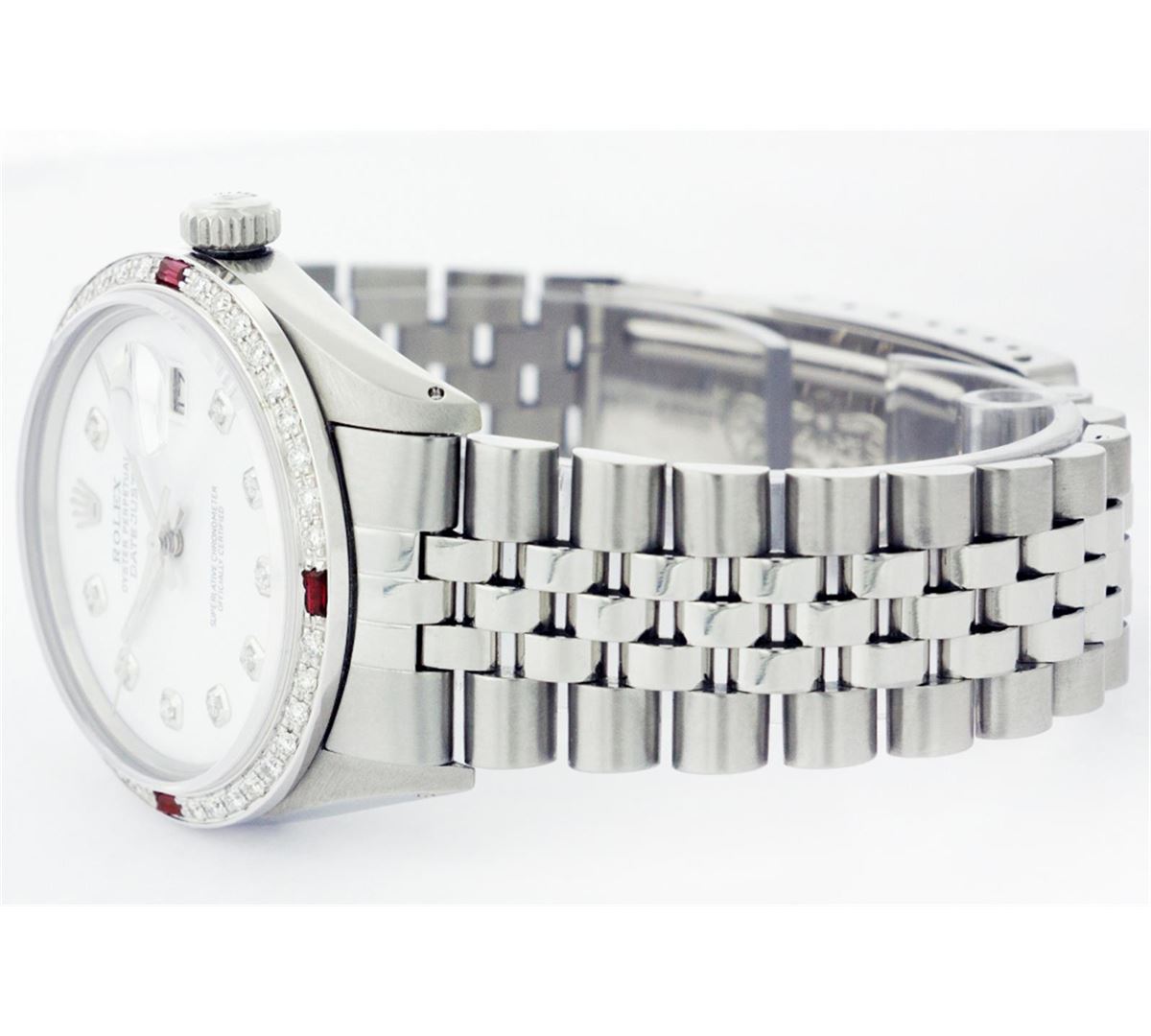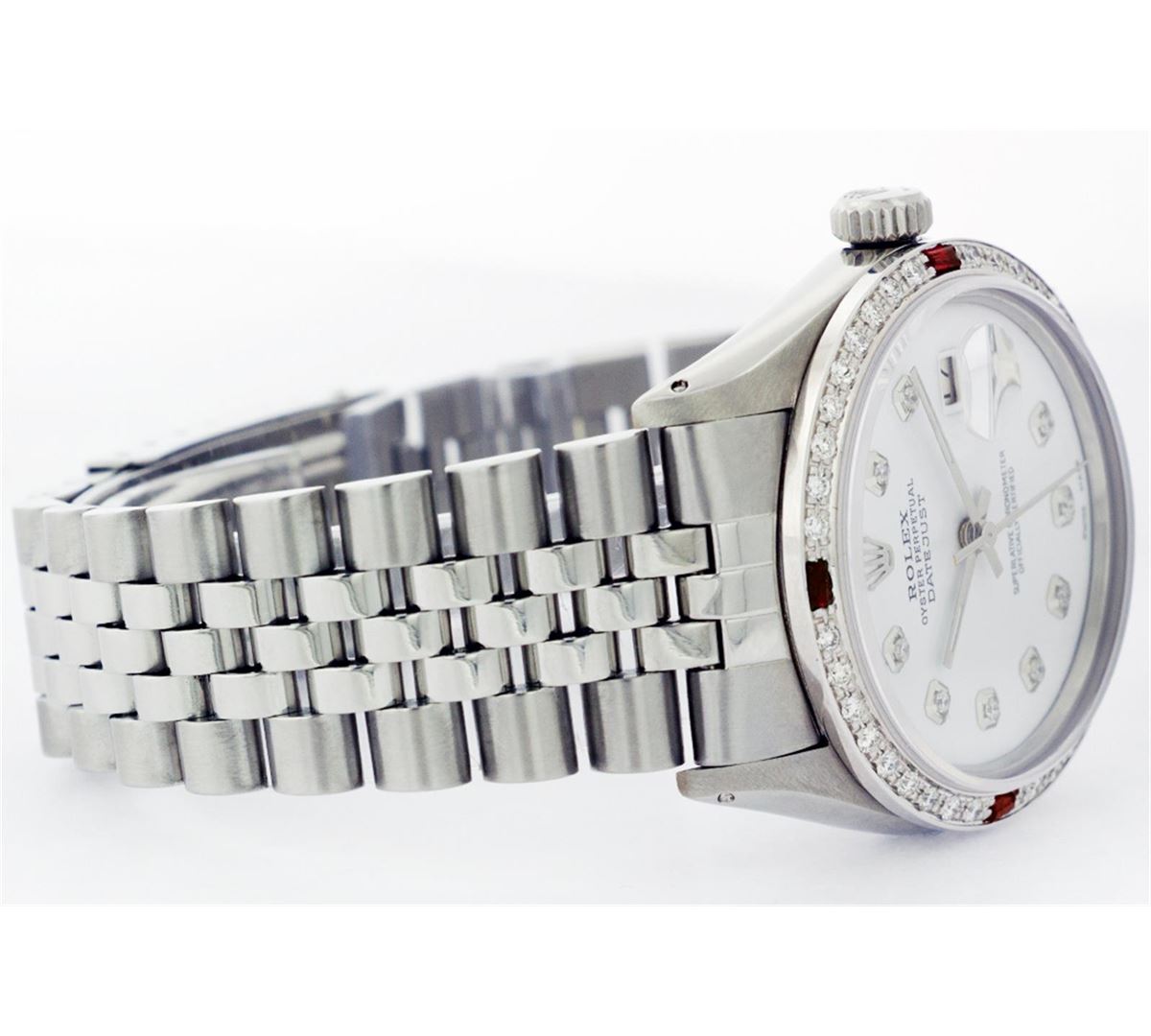 One Mens Stainless Steel Rolex Datejust Polished Bright with Satin Finish, Fully Serviced & Electronically Tested, Stainless Steel Case:36mm, Stainless Steel Crown, Custom Bezel: 18K White Gold Ruby Beadset Diamond Bezel, Diamond Count: 36 Diamonds + 4 Rubies, Total Weight 1.00 Carat, Clarity: SI-VS, Color: G to H. Custom Crystal: Synthetic Sapphire Cyclops Lens. Movement: Automatic Winding Movement Caliber 3035. Custom Dial: Mother Of Pearl Diamond Dial, 10 Diamonds in Dial, G To H In Color, Clarity: SI-VS. Date Window: 3 O'Clock Position Date Display, Quickset, Model: Datejust, Condition: G-6 Extra Fine. Bracelet:Stainless Steel Jubilee. Bright Polish & Satin Finish. 6.5 Inch Length, Adjustable. Standard Clasp, With Rolex Logo.