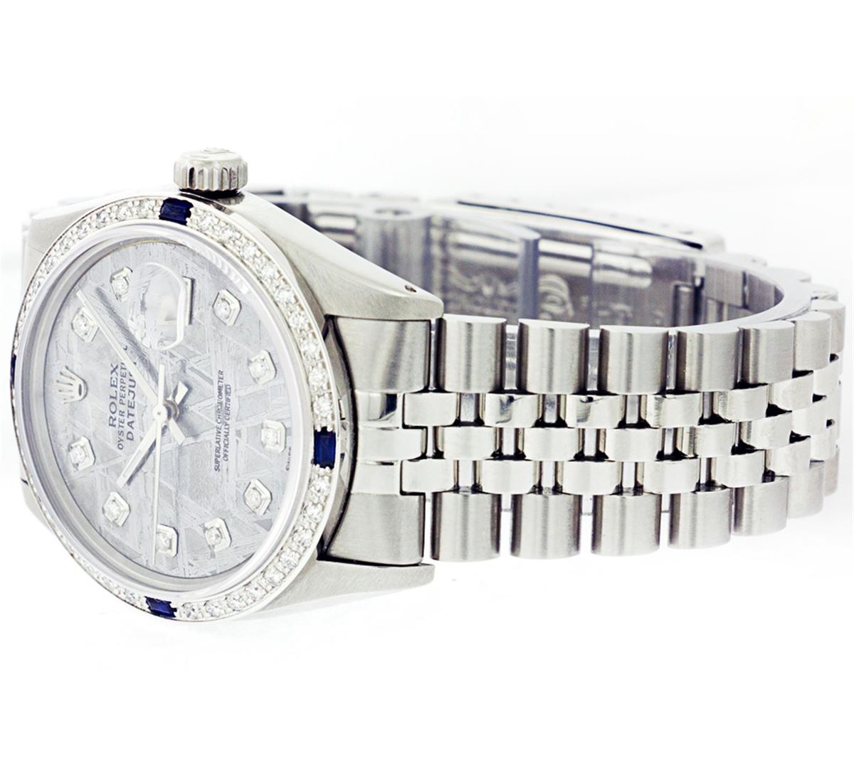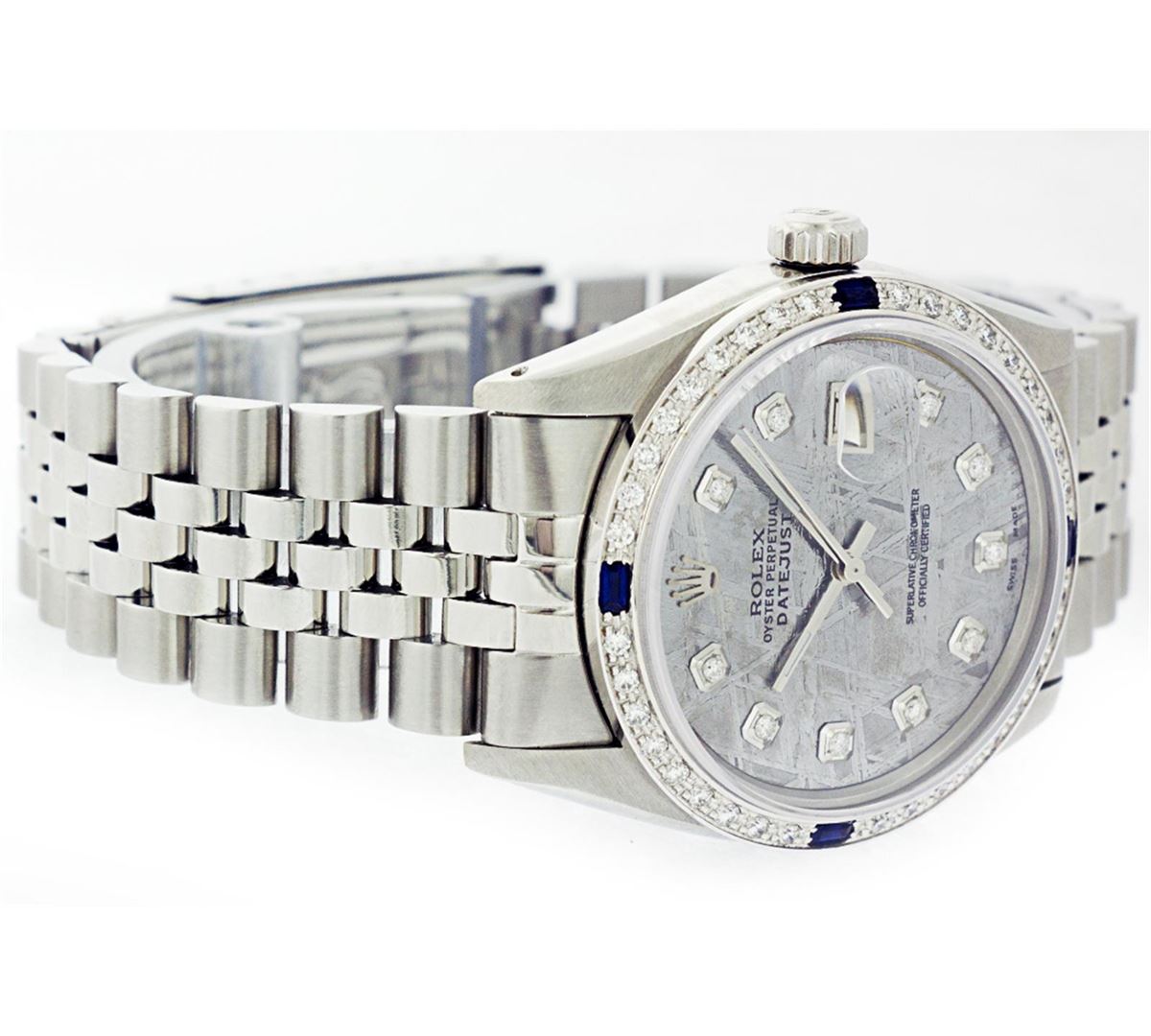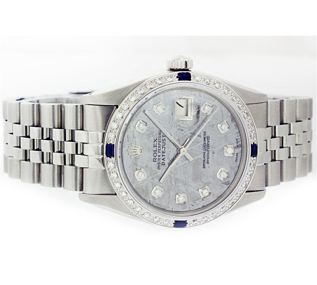 One Mens Stainless Steel Rolex Datejust Polished Bright with Satin Finish, Fully Serviced & Electronically Tested, Stainless Steel Case:36mm, Stainless Steel Crown, Custom Bezel: 18K White Gold Sapphire Beadset Diamond Bezel, Diamond Count: 36 Diamonds + 4 Sapphire, Total Weight 1.00 Carat, Clarity: SI-VS, Color: G to H. Custom Crystal: Synthetic Sapphire Cyclops Lens. Movement: Automatic Winding Movement Caliber 3035. Custom Dial: Meteorite Diamond Dial, 10 Diamonds in Dial, G To H In Color, Clarity: SI-VS. Date Window: 3 O'Clock Position Date Display, Quickset, Model: Datejust, Condition: G-6 Extra Fine. Bracelet:Stainless Steel Jubilee. Bright Polish & Satin Finish. 6.5 Inch Length, Adjustable. Standard Clasp, With Rolex Logo.