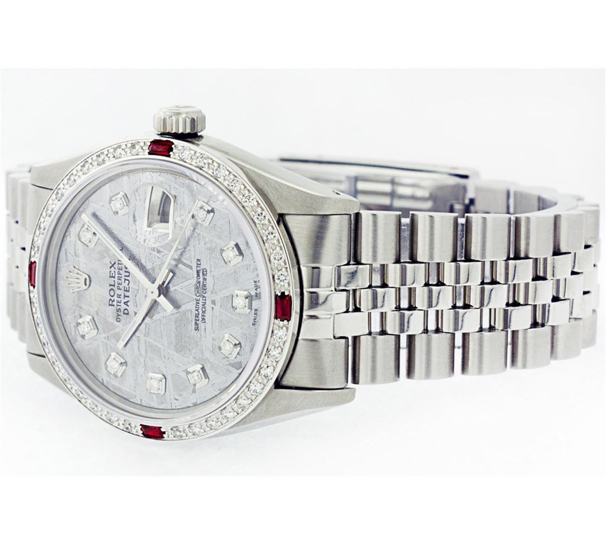 One Mens Stainless Steel Rolex Datejust Polished Bright with Satin Finish, Fully Serviced & Electronically Tested, Stainless Steel Case:36mm, Stainless Steel Crown, Custom Bezel: 18K White Gold Ruby Beadset Diamond Bezel, Diamond Count: 36 Diamonds + 4 Rubies, Total Weight 1.00 Carat, Clarity: SI-VS, Color: G to H. Custom Crystal: Synthetic Sapphire Cyclops Lens. Movement: Automatic Winding Movement Caliber 3035. Custom Dial: Meteorite Diamond Dial, 10 Diamonds in Dial, G To H In Color, Clarity: SI-VS. Date Window: 3 O'Clock Position Date Display, Quickset, Model: Datejust, Condition: G-6 Extra Fine. Bracelet:Stainless Steel Jubilee. Bright Polish & Satin Finish. 6.5 Inch Length, Adjustable. Standard Clasp, With Rolex Logo.