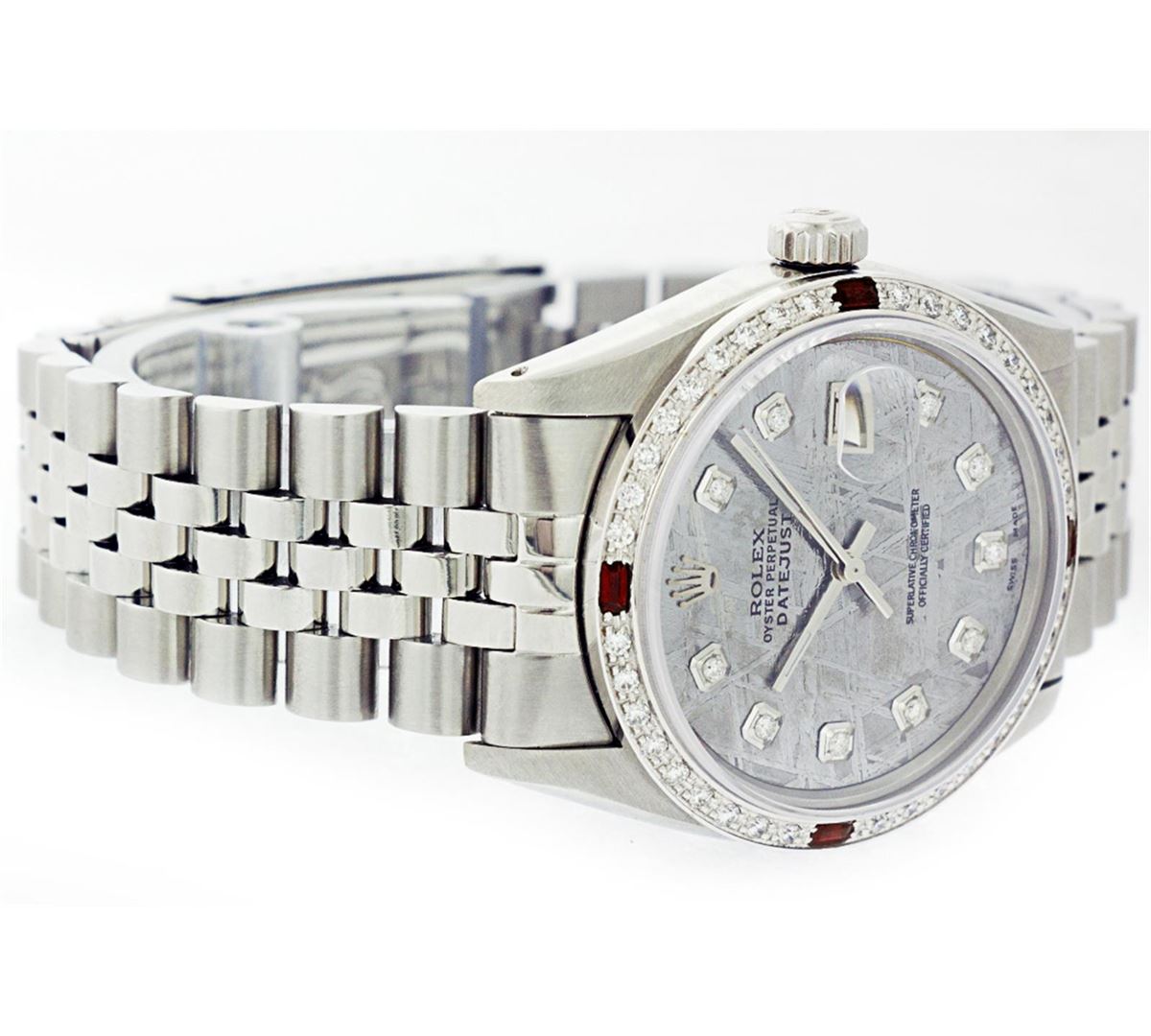 One Mens Stainless Steel Rolex Datejust Polished Bright with Satin Finish, Fully Serviced & Electronically Tested, Stainless Steel Case:36mm, Stainless Steel Crown, Custom Bezel: 18K White Gold Ruby Beadset Diamond Bezel, Diamond Count: 36 Diamonds + 4 Rubies, Total Weight 1.00 Carat, Clarity: SI-VS, Color: G to H. Custom Crystal: Synthetic Sapphire Cyclops Lens. Movement: Automatic Winding Movement Caliber 3035. Custom Dial: Meteorite Diamond Dial, 10 Diamonds in Dial, G To H In Color, Clarity: SI-VS. Date Window: 3 O'Clock Position Date Display, Quickset, Model: Datejust, Condition: G-6 Extra Fine. Bracelet:Stainless Steel Jubilee. Bright Polish & Satin Finish. 6.5 Inch Length, Adjustable. Standard Clasp, With Rolex Logo.