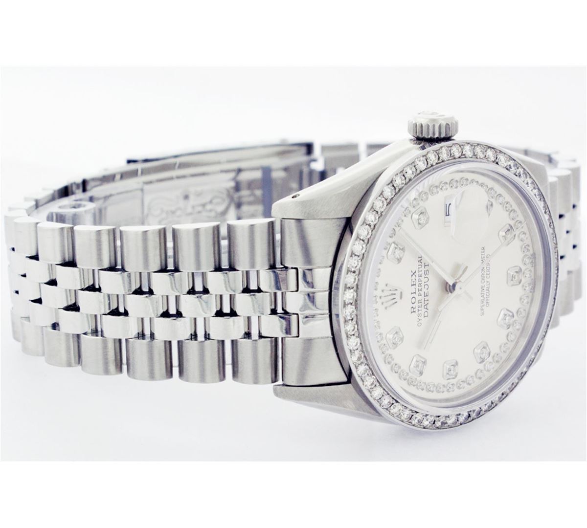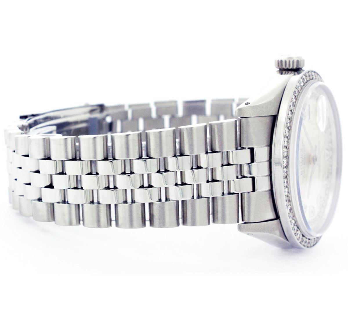 One Mens Rolex Datejust Polished, Serviced & Electronically Tested, Stainless Steel Case:36mm, Stainless Steel Crown, Custom Bezel: Stainless Steel Beadset Diamond Bezel, Diamond Count: 54 Diamonds, Total Weight 1.00 Carat, Clarity: SI-VS, Color: G to H. Custom Crystal: Synthetic Sapphire Cyclops Lens. Movement: Automatic Winding Movement Caliber 3035. Custom Dial: Silver String Diamond Dial, Diamond Count: 54 Diamonds In Dial, Clarity: SI-VS, Color: G to H. Date Window: 3 O'Clock Position Date Display, Quickset, Model: 16014 Condition: G-6 Extra Fine. Bracelet: Stainless Steel Jubilee. Bright Polish & Satin Finish. 6.5 Inch Length, Adjustable. Standard Clasp, With Rolex Logo.