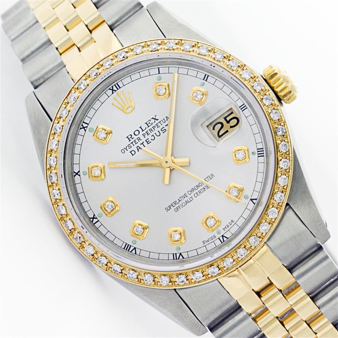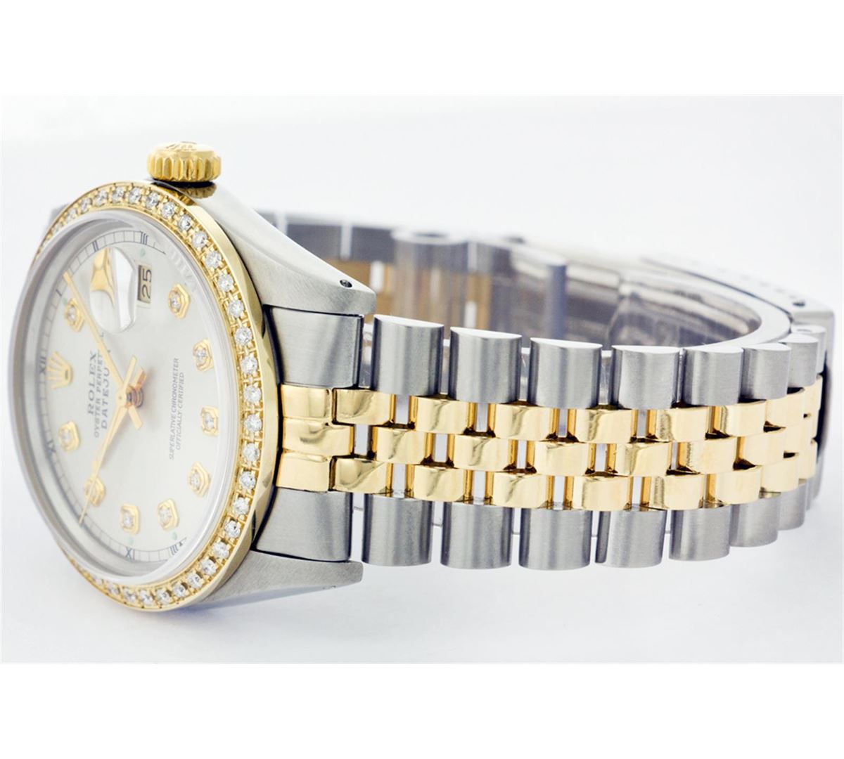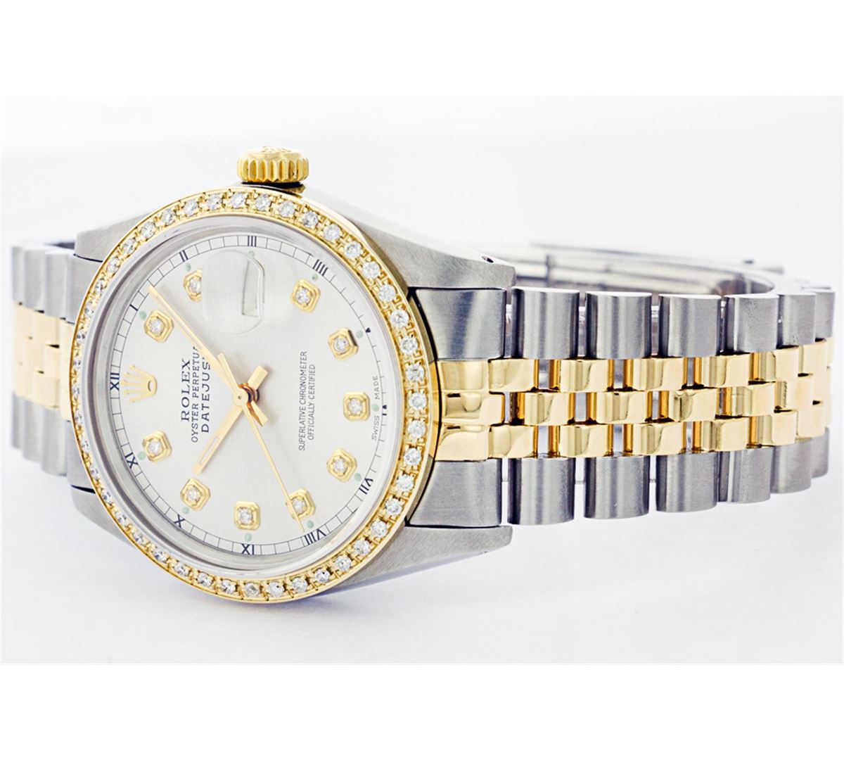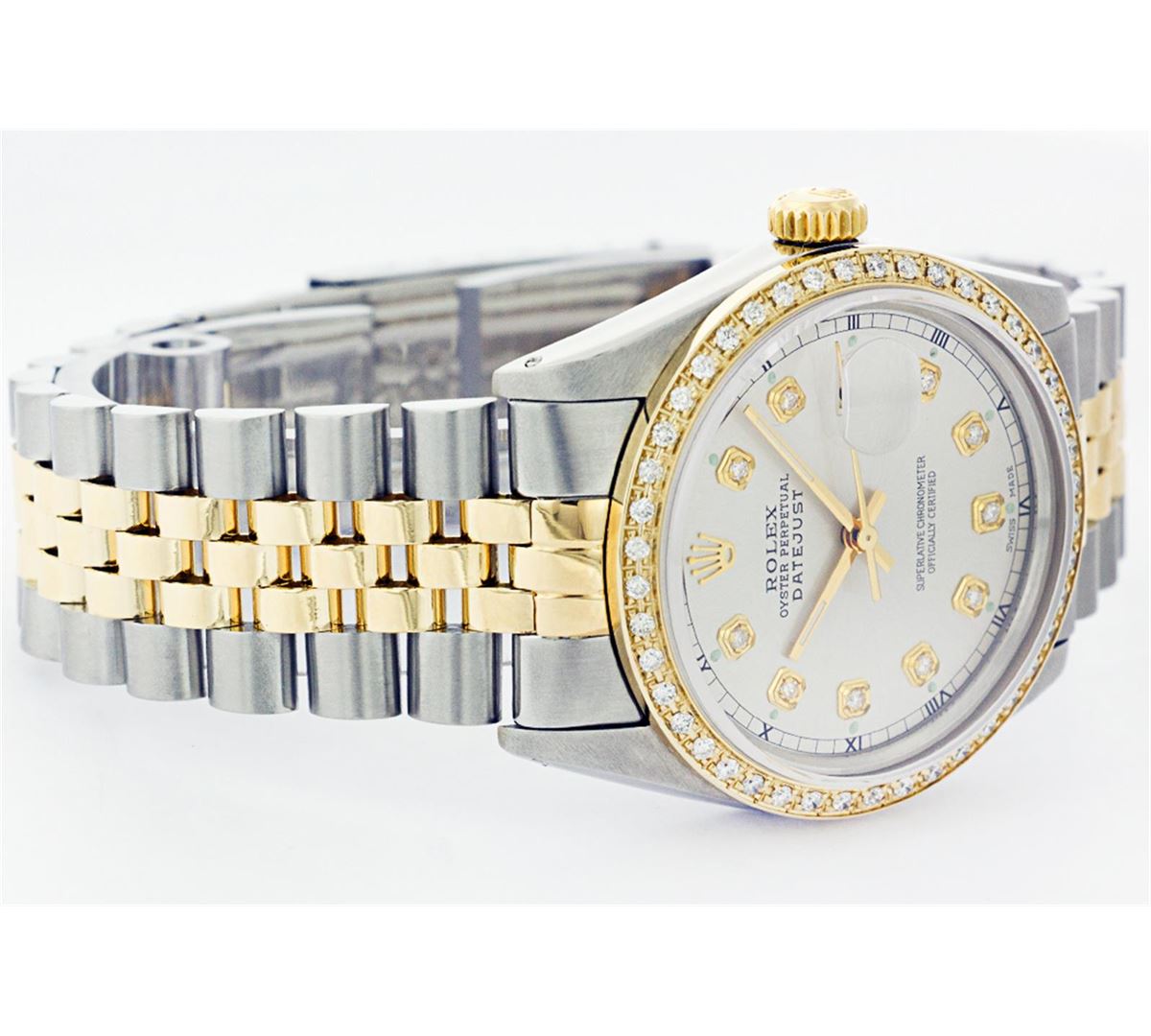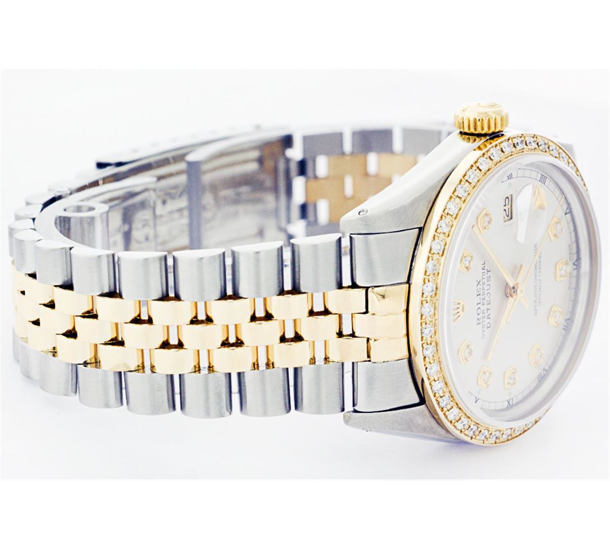 One Mens Two Tone Rolex Datejust Polished, Fully Serviced & Electronically Tested, 14K Yellow Gold & Stainless Steel Case:36mm, 14K Yellow Gold Crown, Custom Bezel: 18K Yellow Gold Beadset Diamond Bezel, Diamond Count: 44 Diamonds, Total Weight 1.0 Carat, Clarity: Si-VS, Color: G to H. Custom Crystal: Synthetic Sapphire Cyclops Lens. Movement: Automatic Winding Movement Caliber 3035. Custom Dial: Silver Diamond Dial With Square Track and Luminescent Dots. Diamond Count: 10 Diamonds In Dial, Color: G to H, Clarity: SI-VS. Date Window: 3 O'Clock Position Date Display, Quickset, Model: Datejust Condition: G-6 Extra Fine. Bracelet: Two Tone 14K Yellow Gold & Stainless Steel Jubilee. Bright Polish. 6.5 Inch Length, Adjustable. Standard Clasp, With Rolex Logo.
