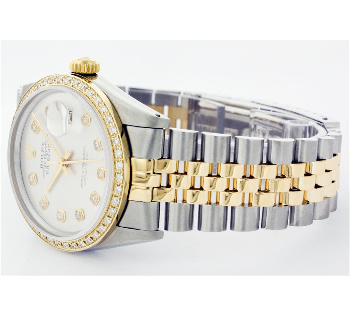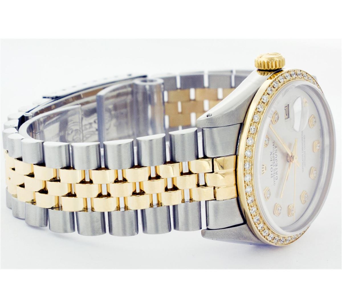 One Mens Two Tone Rolex Datejust Polished, Fully Serviced & Electronically Tested, 14K Yellow Gold & Stainless Steel Case:36mm, 14K Yellow Gold Crown, Custom Bezel: 18K Yellow Gold Beadset Diamond Bezel, Diamond Count: 44 Diamonds, Total Weight 1.0 Carat, Clarity: Si-VS, Color: G to H. Custom Crystal: Synthetic Sapphire Cyclops Lens. Movement: Automatic Winding Movement Caliber 3035. Custom Dial: Silver Diamond Dial, Diamond Count: 10 Diamonds In Dial, Clarity: SI-VS, Color: G to H. Date Window: 3 O'Clock Position Date Display, Quickset, Model: Datejust Condition: G-6 Extra Fine. Bracelet: Two Tone 14K Yellow Gold & Stainless Steel Jubilee. Bright Polish. 6.5 Inch Length, Adjustable. Standard Clasp, With Rolex Logo.