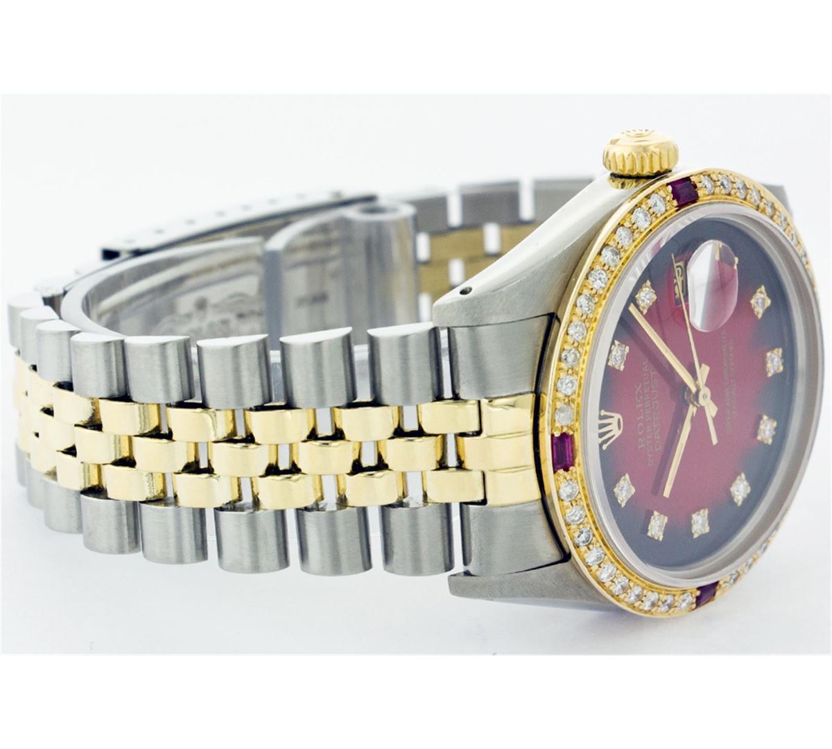 One Mens Two Tone Rolex Datejust Polished, Fully Serviced & Electronically Tested, 14K Yellow Gold & Stainless Steel Case:36mm, 14K Yellow Gold Crown, Custom Bezel: 18K Yellow Gold Ruby Beadset Diamond Bezel, Diamond Count: 36 Diamonds + 4 Rubies, Total Weight 1.0 Carat, Clarity: Si-VS, Color: G to H. Custom Crystal: Synthetic Sapphire Cyclops Lens. Movement: Automatic Winding Movement Caliber 3035. Custom Dial: Red Vignette Diamond Dial, Diamond Count: 10 Diamonds In Dial, Color: G to H, Clarity: SI -VS. Date Window: 3 O'Clock Position Date Display, Quickset, Model: Datejust Condition: G-6 Extra Fine. Bracelet: Two Tone 14K Yellow Gold & Stainless Steel Jubilee. Bright Polish. 6.5 Inch Length, Adjustable. Standard Clasp, With Rolex Logo.