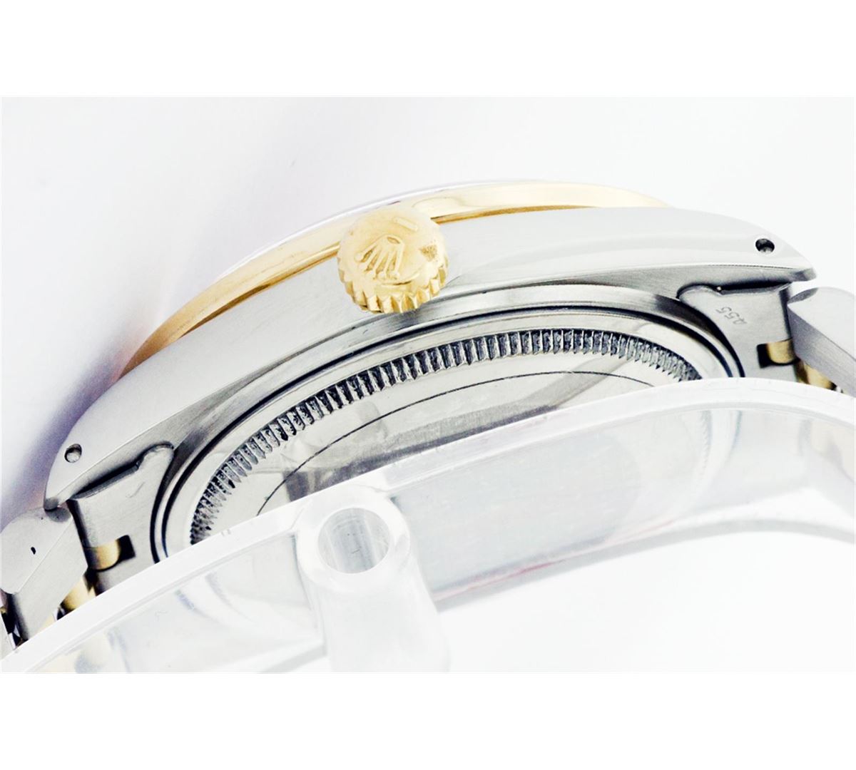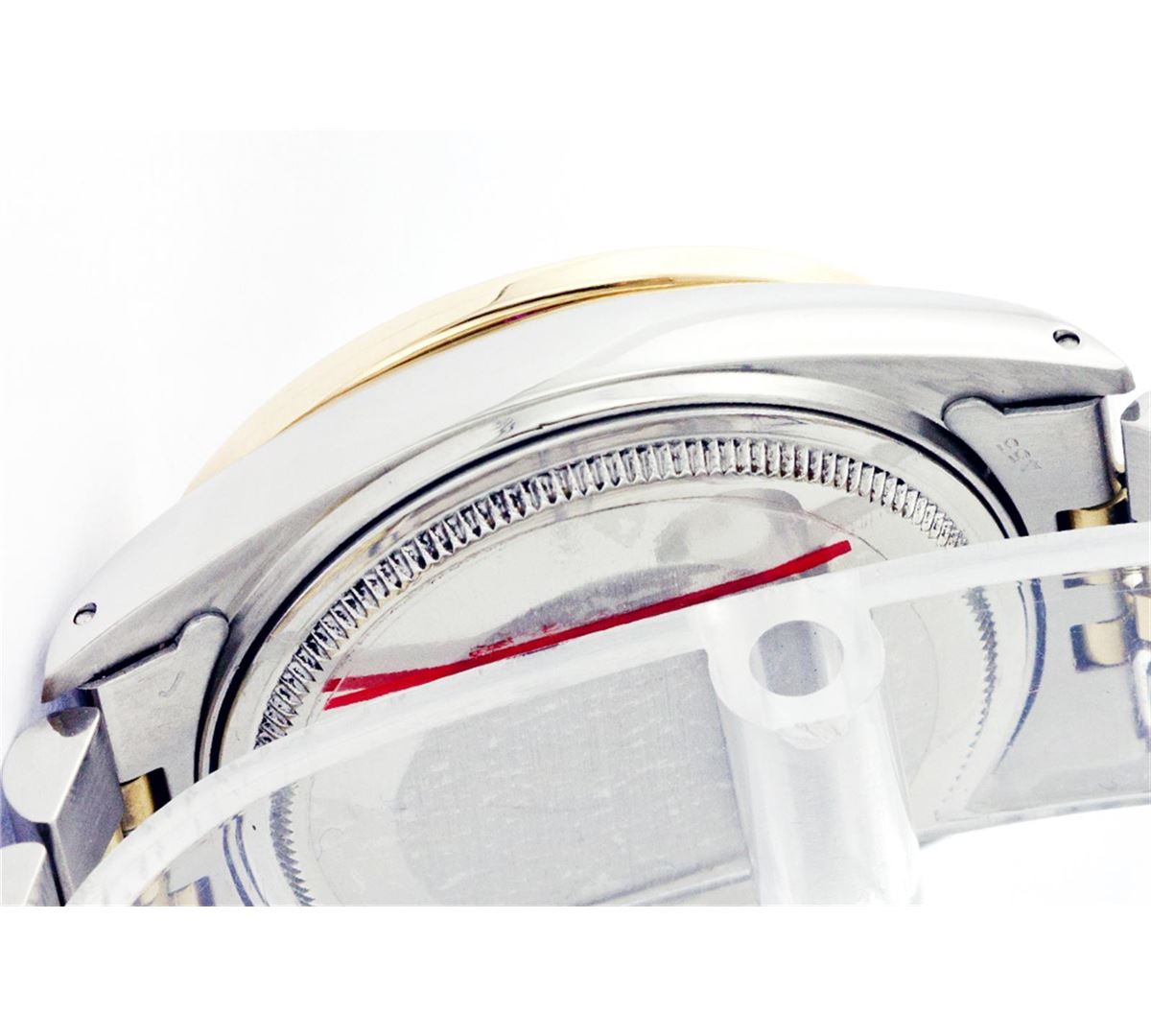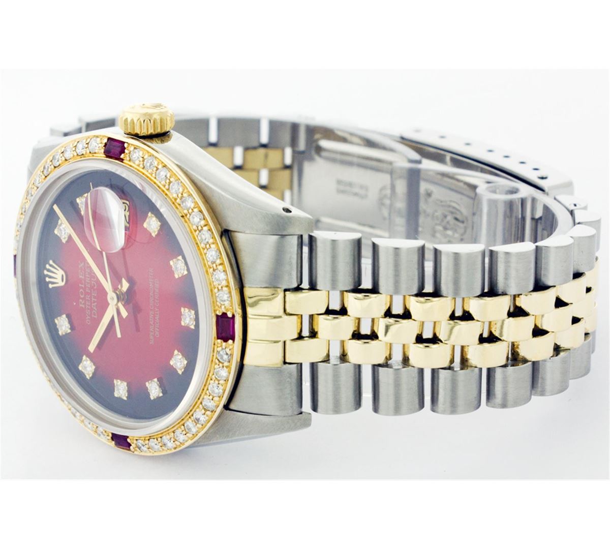 One Mens Two Tone Rolex Datejust Polished, Fully Serviced & Electronically Tested, 14K Yellow Gold & Stainless Steel Case:36mm, 14K Yellow Gold Crown, Custom Bezel: 18K Yellow Gold Ruby Beadset Diamond Bezel, Diamond Count: 36 Diamonds + 4 Rubies, Total Weight 1.0 Carat, Clarity: Si-VS, Color: G to H. Custom Crystal: Synthetic Sapphire Cyclops Lens. Movement: Automatic Winding Movement Caliber 3035. Custom Dial: Red Vignette Diamond Dial, Diamond Count: 10 Diamonds In Dial, Color: G to H, Clarity: SI -VS. Date Window: 3 O'Clock Position Date Display, Quickset, Model: Datejust Condition: G-6 Extra Fine. Bracelet: Two Tone 14K Yellow Gold & Stainless Steel Jubilee. Bright Polish. 6.5 Inch Length, Adjustable. Standard Clasp, With Rolex Logo.