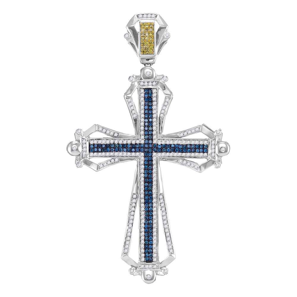 REF-109H1W - SKU: GD42185 ---- Mens Round Blue & Yellow Color Enhanced Diamond Cross Charm Pendant 1-1/2 Cttw 10kt White Gold