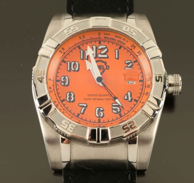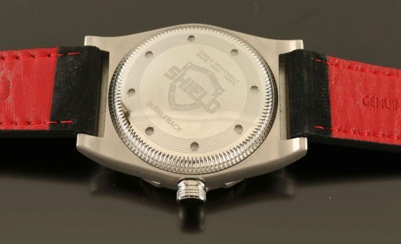 Waterproof 50ATM/500m/1640ft Pilecki Bubbleback automatic diver's watch on black suede leather band.