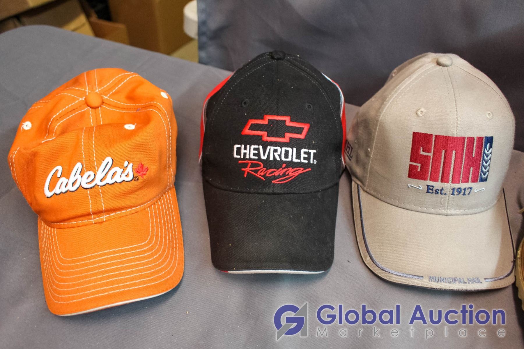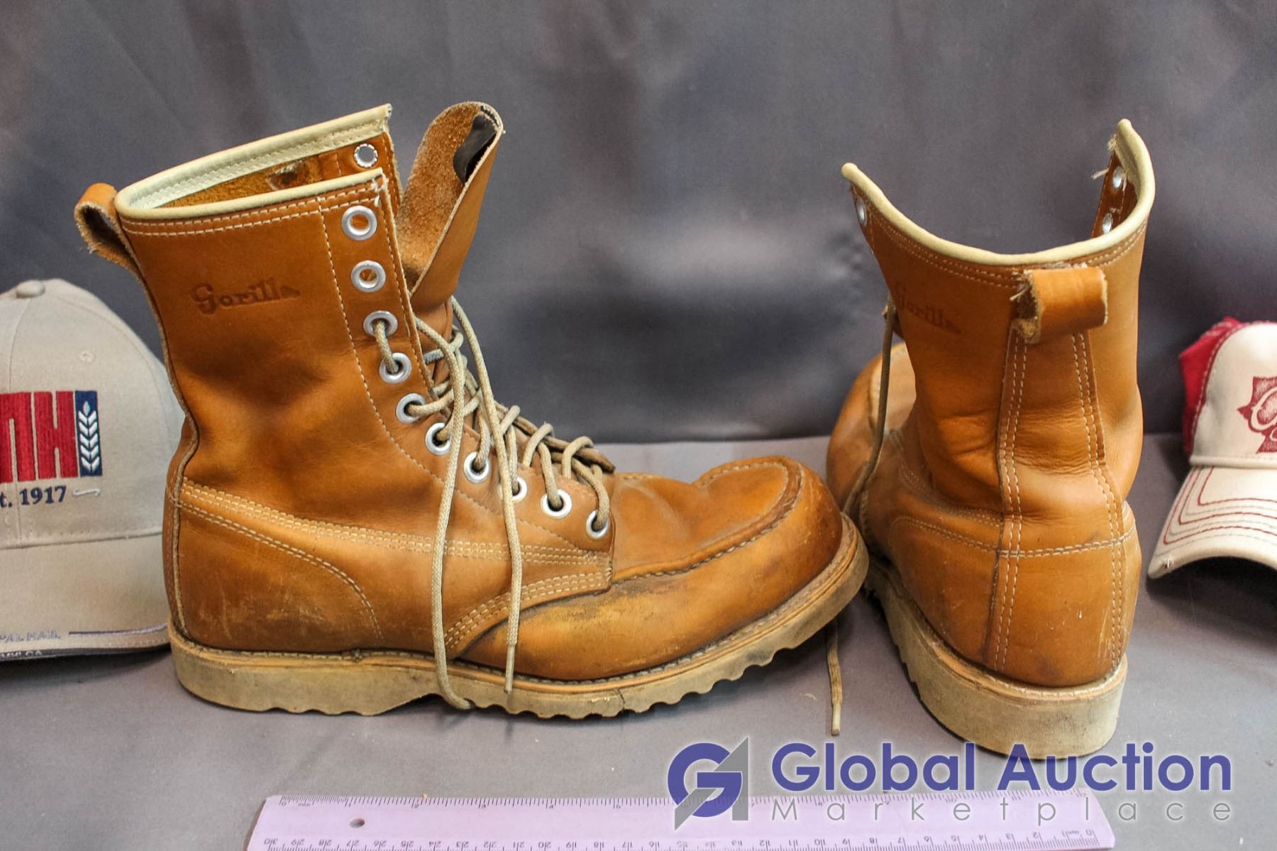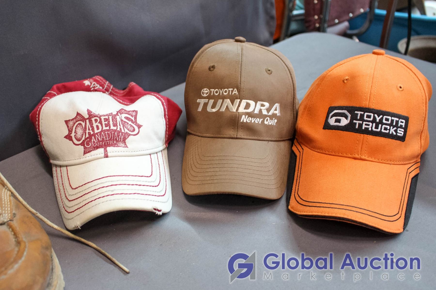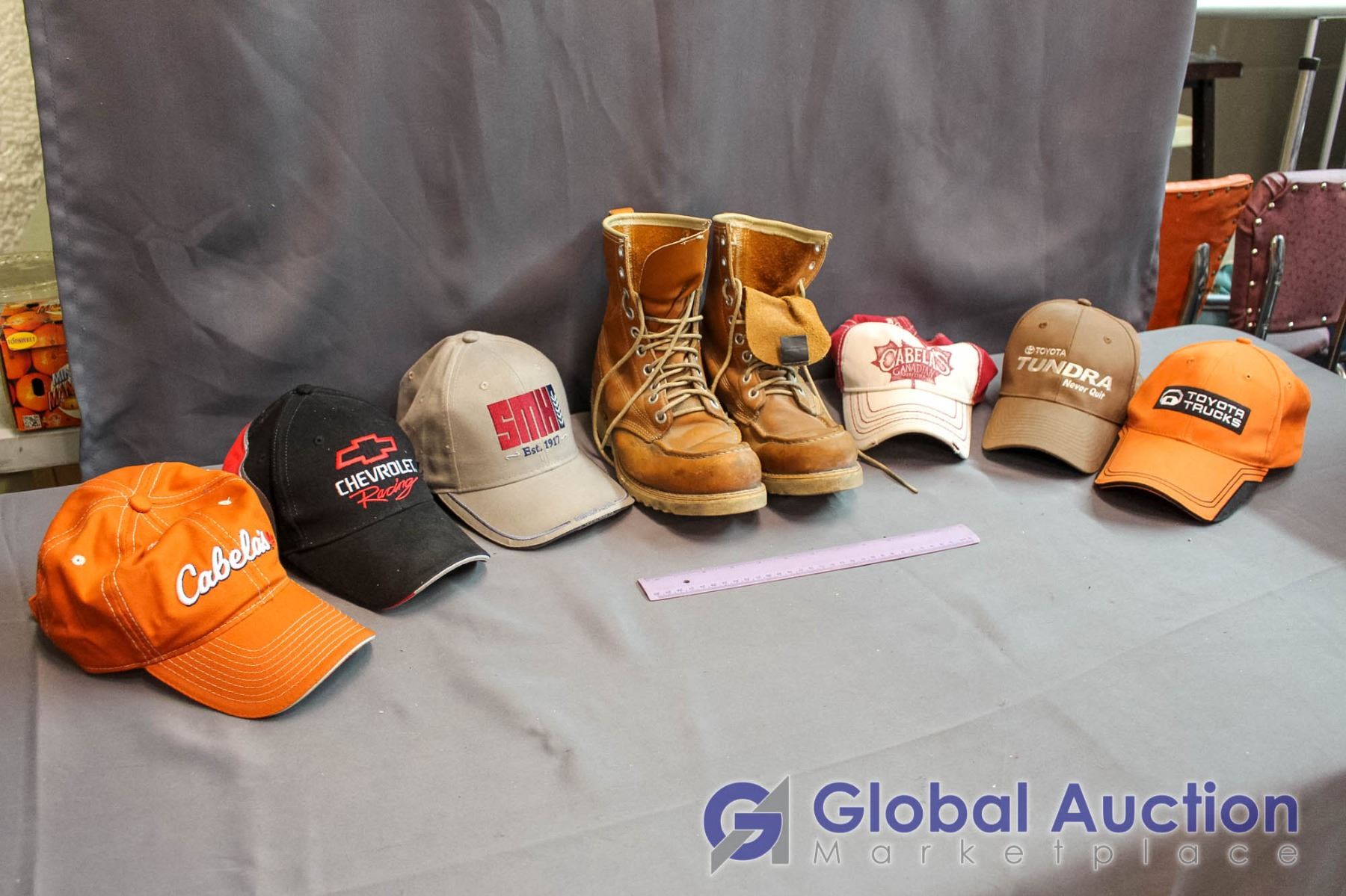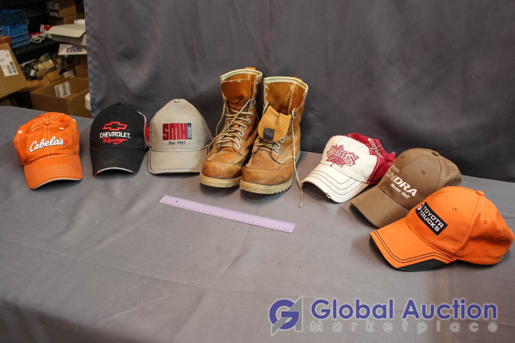 Mens Size 10 Work Boots and Collection of Hats (6 - Cabelas, Toyota, Chevrolet, etc)