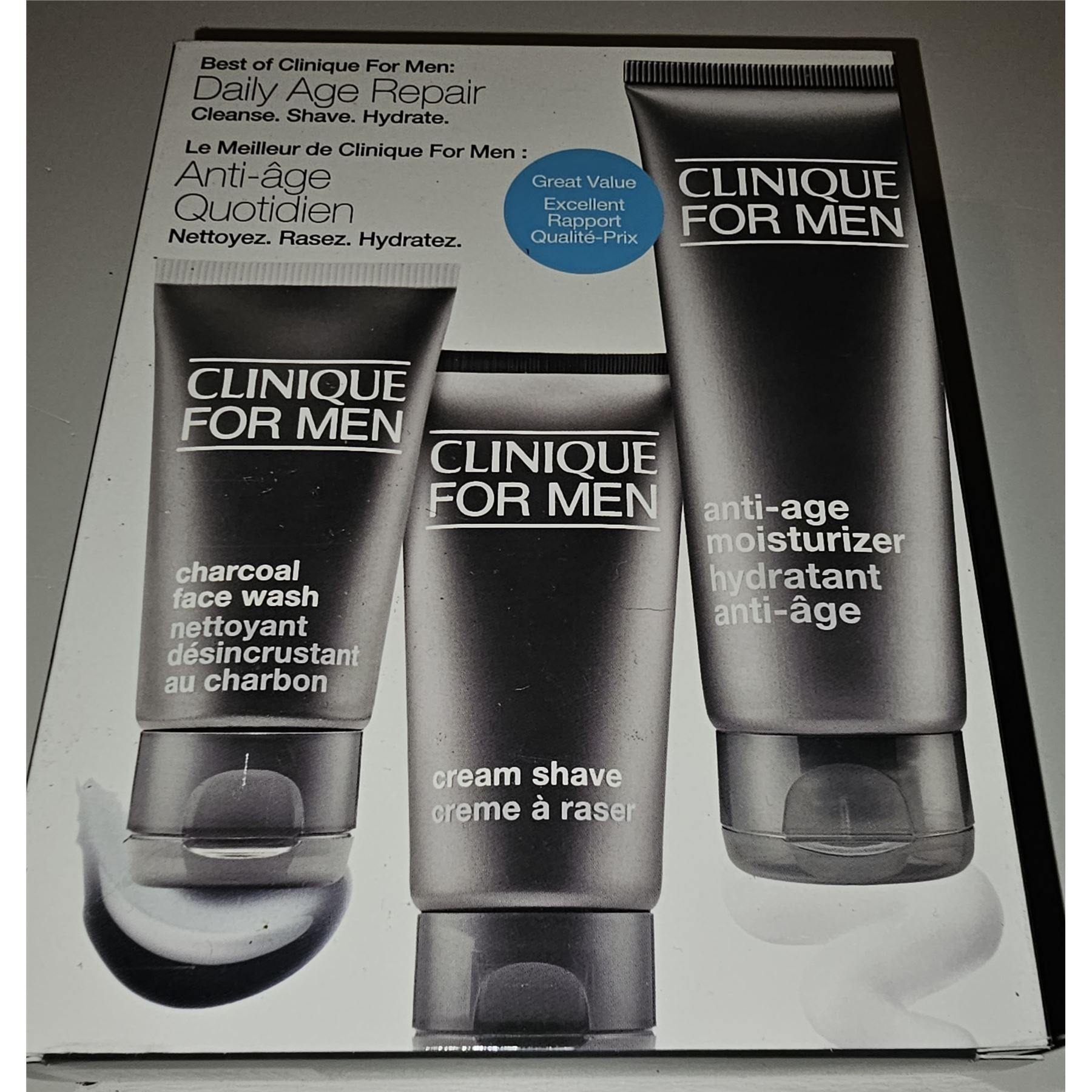 Charcoal face wash, cream shave, and anti-age moisturizer, ideal for daily skincare routine, new.