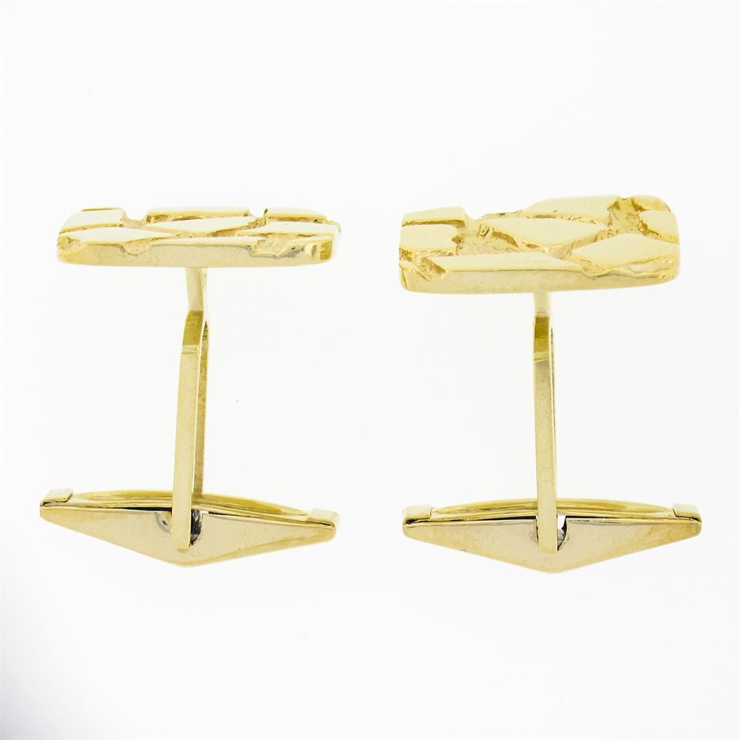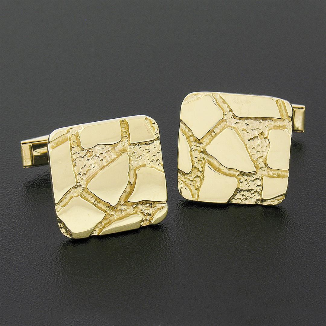 A solid 14k yellow gold cufflinks. These cuff links have a swivel design with a clearance of 15.35mm, weigh a total of 12.42. grams, and the front panels measure 16.35x16.45mm.