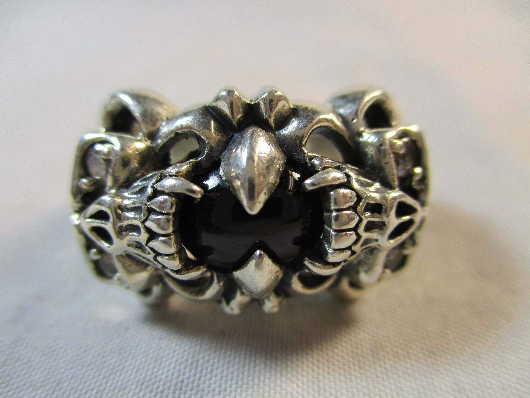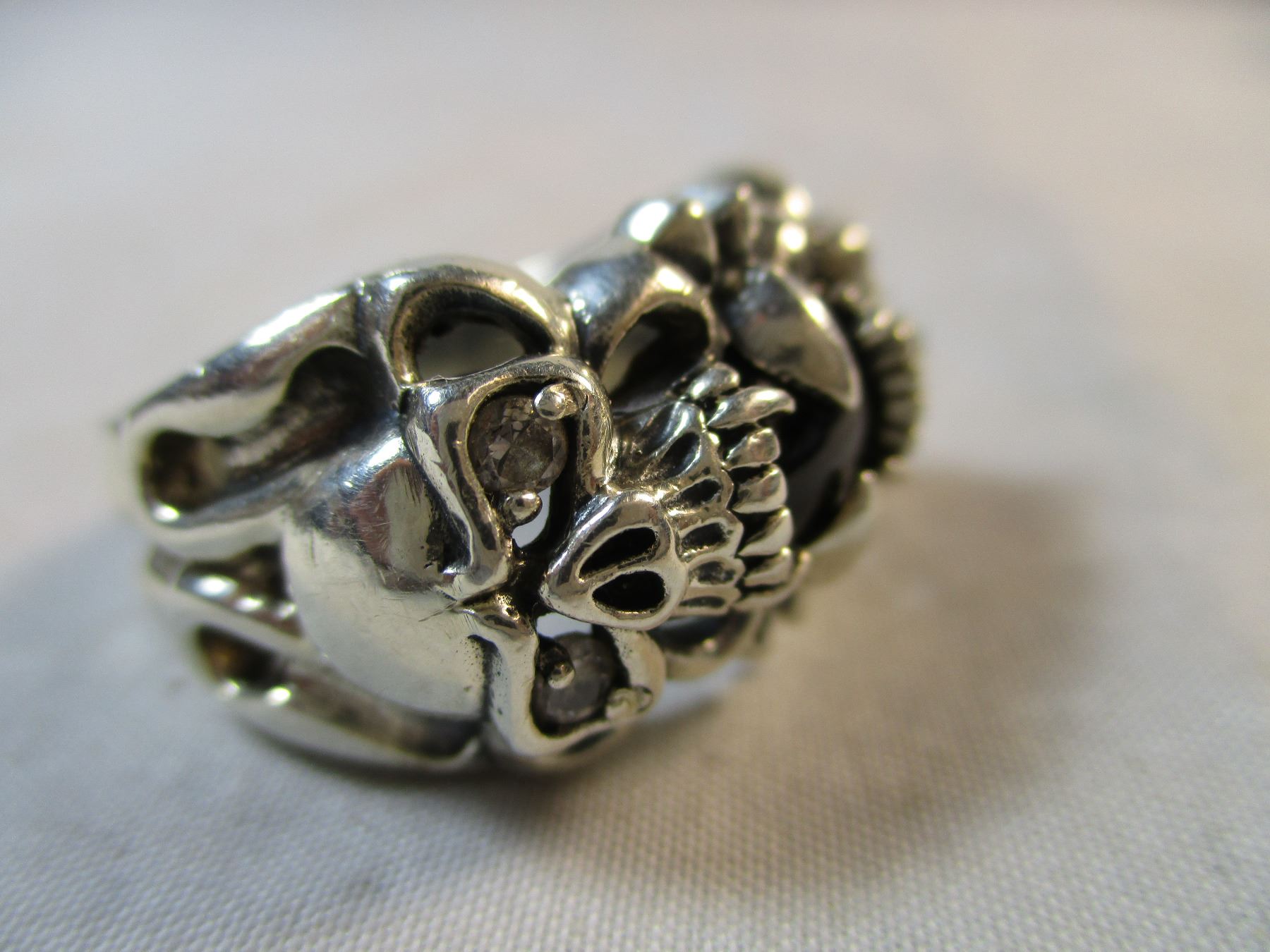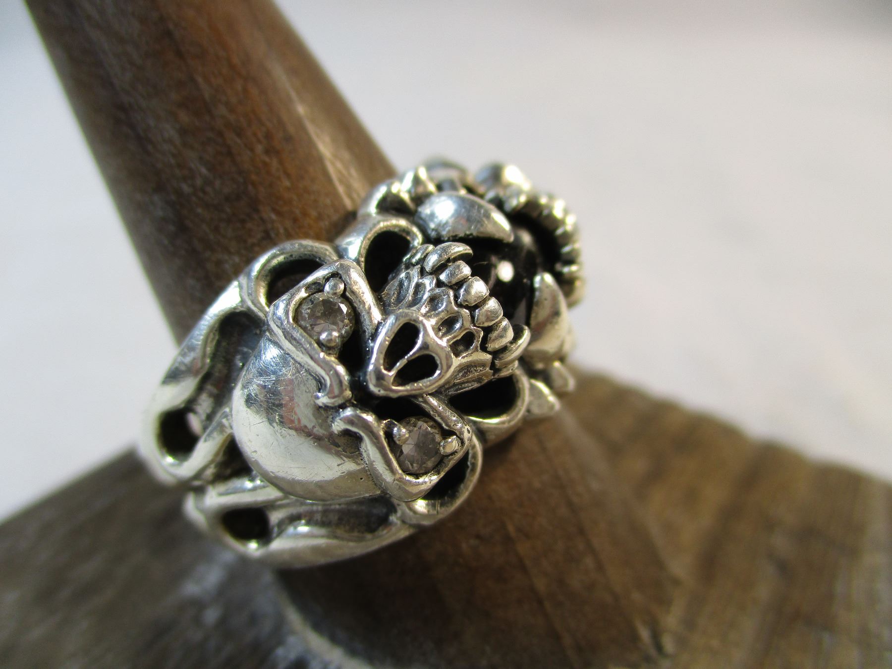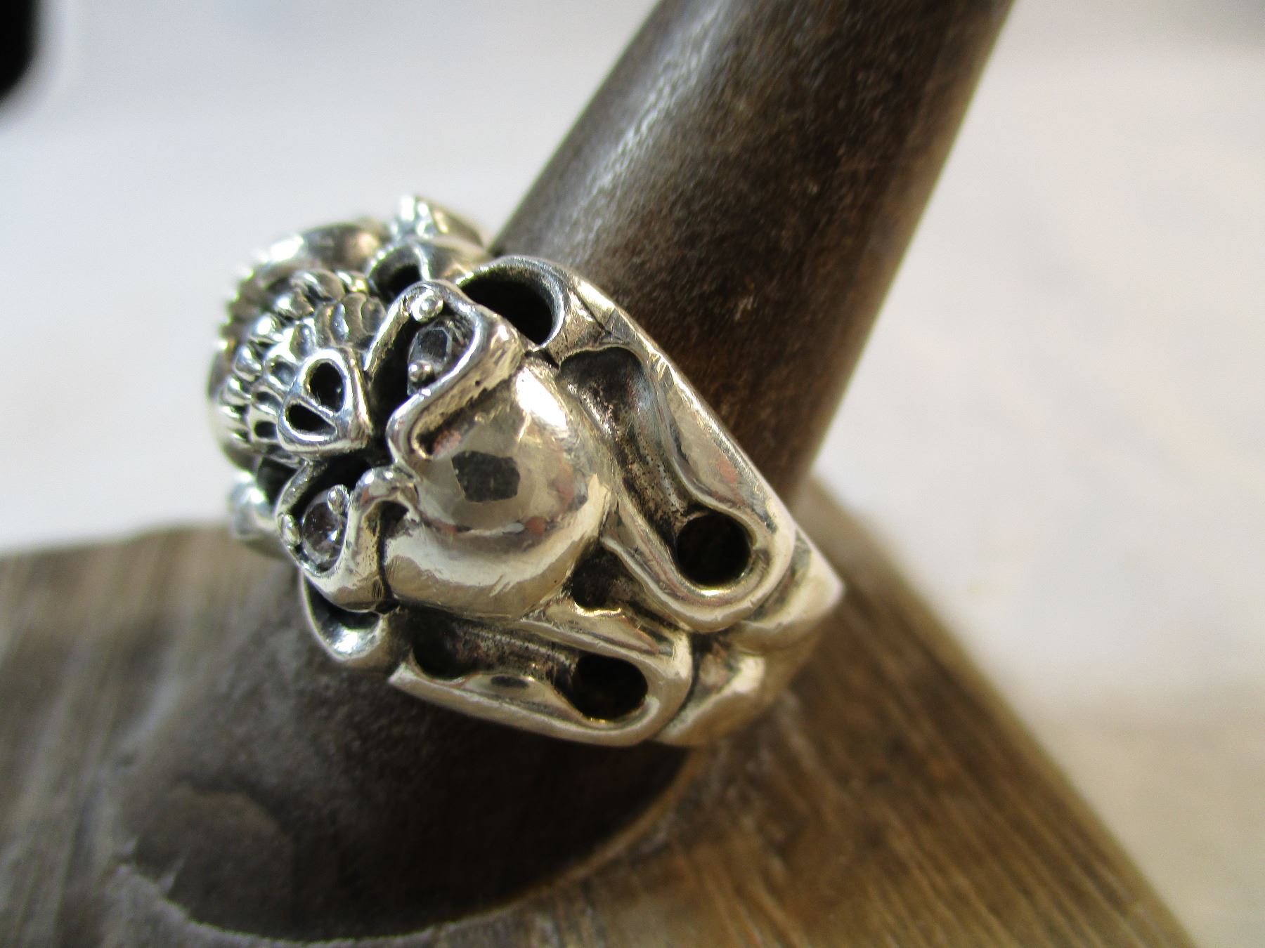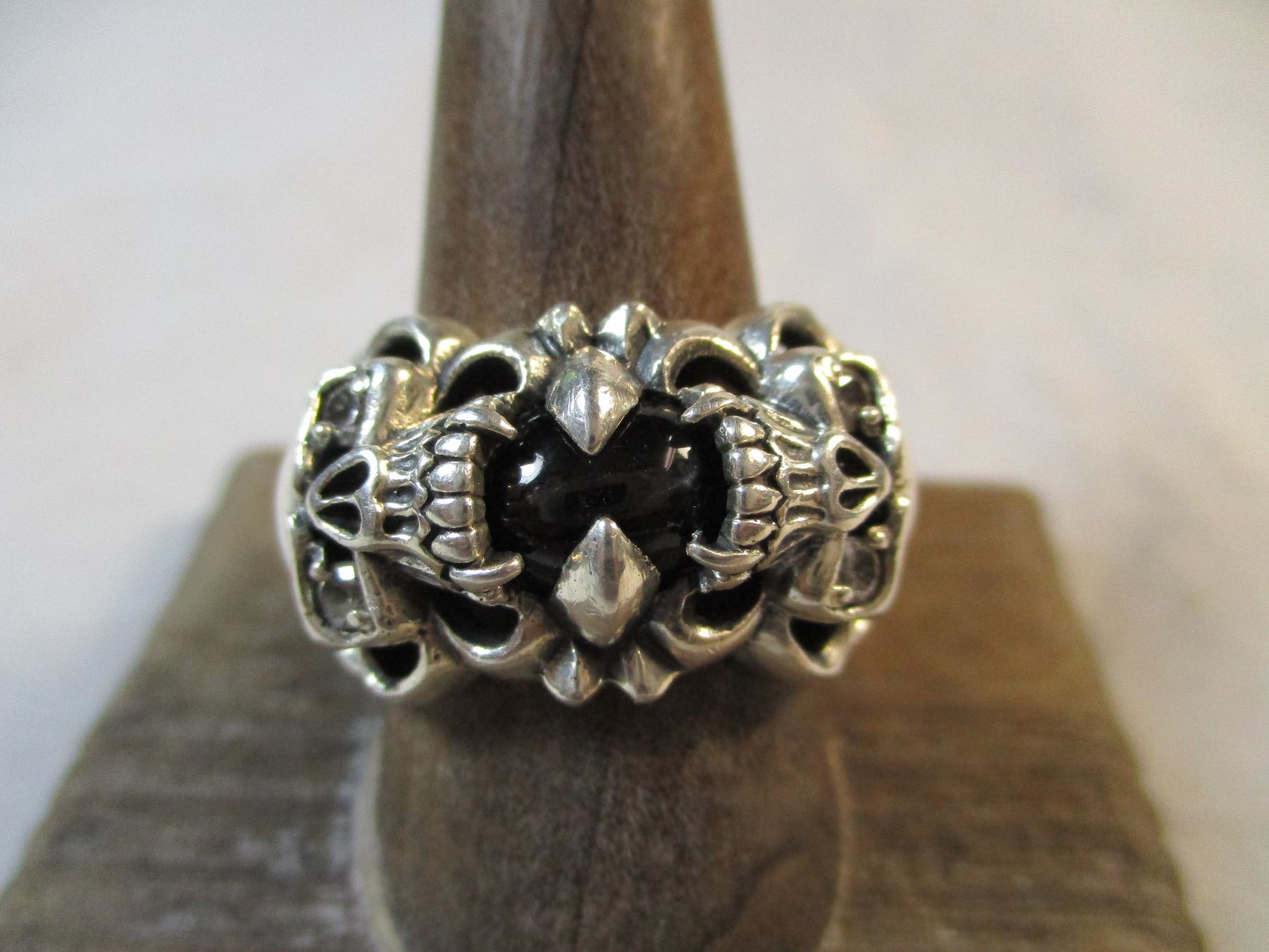 "Heavy mens ring made from Sterling Silver, White Sapphire Eyes and a beautiful black star sapphire between the two skulls.
