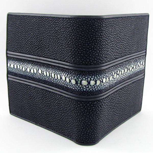 Well made; brand new navy mens Stingray Hide wallet. Sought after tail stripe at center. 4.5" x 3.75" when folded; multiple card slots; bill slots and license flap inside. $295 retail