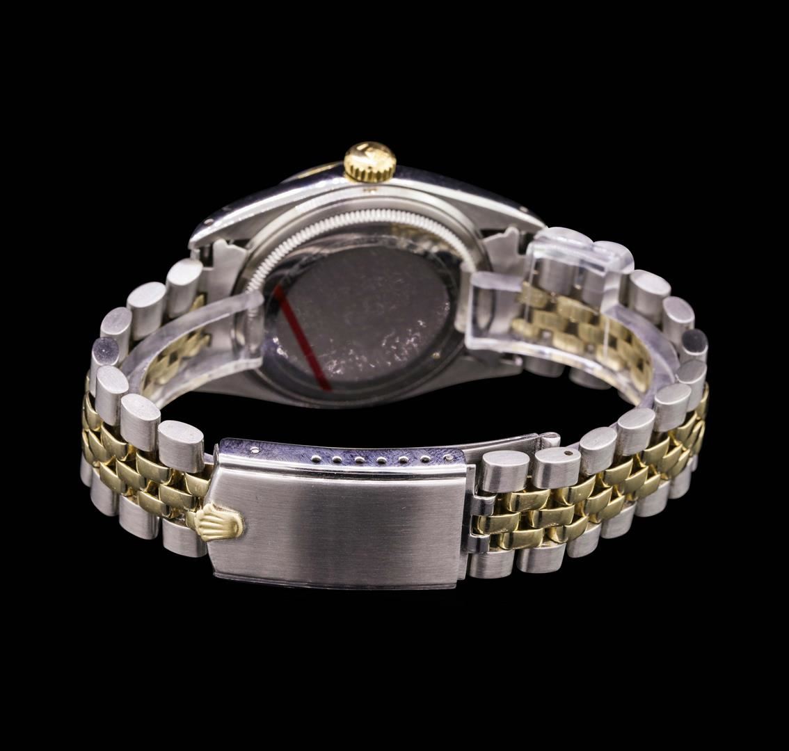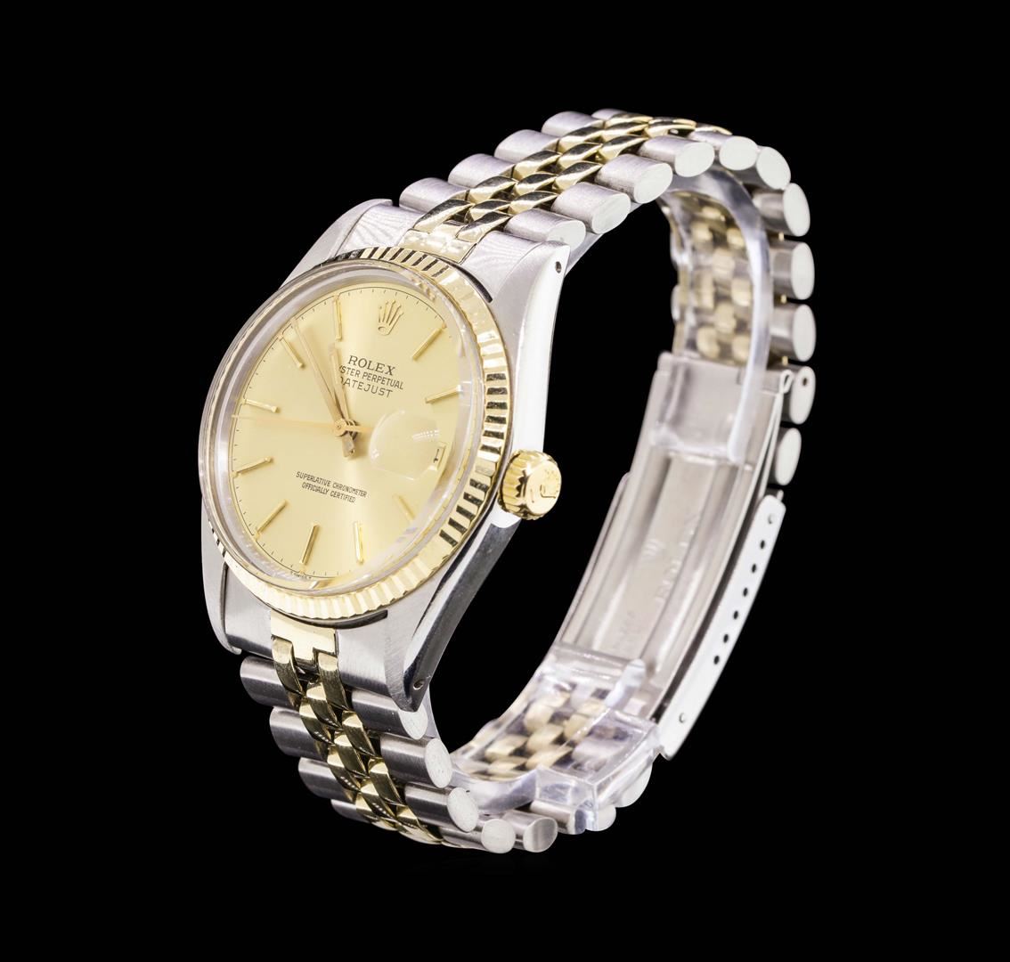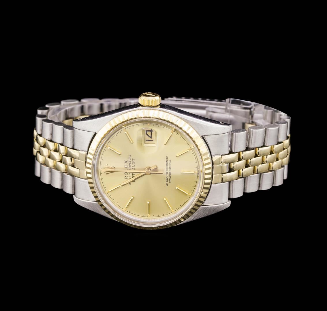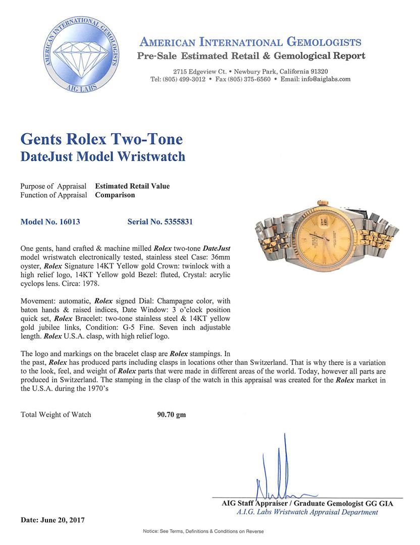 One gents, hand crafted & machine milled Rolex two-tone DateJust model wristwatch electronically tested, stainless steel Case: 36mm oyster, Rolex Signature 14KT Yellow gold Crown: twinlock with a high relief logo, 14KT Yellow gold Bezel: fluted, Crystal: acrylic cyclops lens. Circa: 1978.Movement: automatic, Rolex signed Dial: Champagne color, with baton hands & raised indices, Date Window: 3 o'clock position quick set, Rolex Bracelet: two-tone stainless steel & 14KT yellow gold jubilee links, Condition: G-5 Fine. Seven inch adjustable length. Rolex U.S.A. clasp, with high relief logo.The logo and markings on the bracelet clasp are Rolex stampings. In the past, Rolex has produced parts including clasps in locations other than Switzerland. That is why there is a variation to the look, feel, and weight of Rolex parts that were made in different areas of the world. Today, however all parts are produced in Switzerland. The stamping in the clasp of the watch in this appraisal was created for the Rolex market in the U.S.A. during the 1970'sTotal Weight of Watch 90.70gm. AIG Appraised.