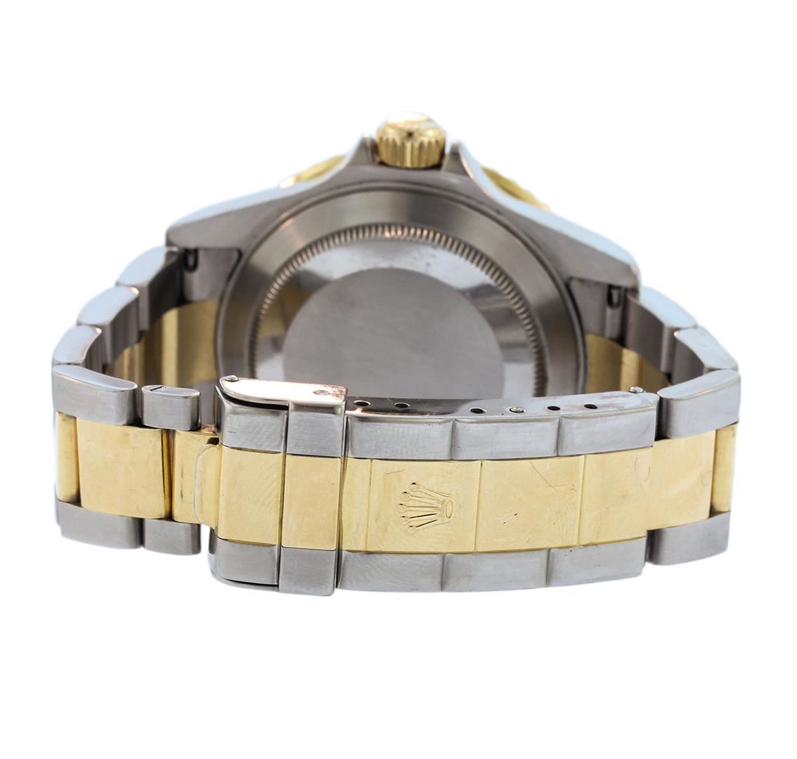 Mens Two-tone stainless steel and 18k yellow gold gents Rolex Submariner wristwatch. Blue dial with gold tone hands and cyclops date window at 3 o`clock position, Automatic Rolex movement, Sapphire Crystal, Quickset Movement, complete with box. In good used condition.