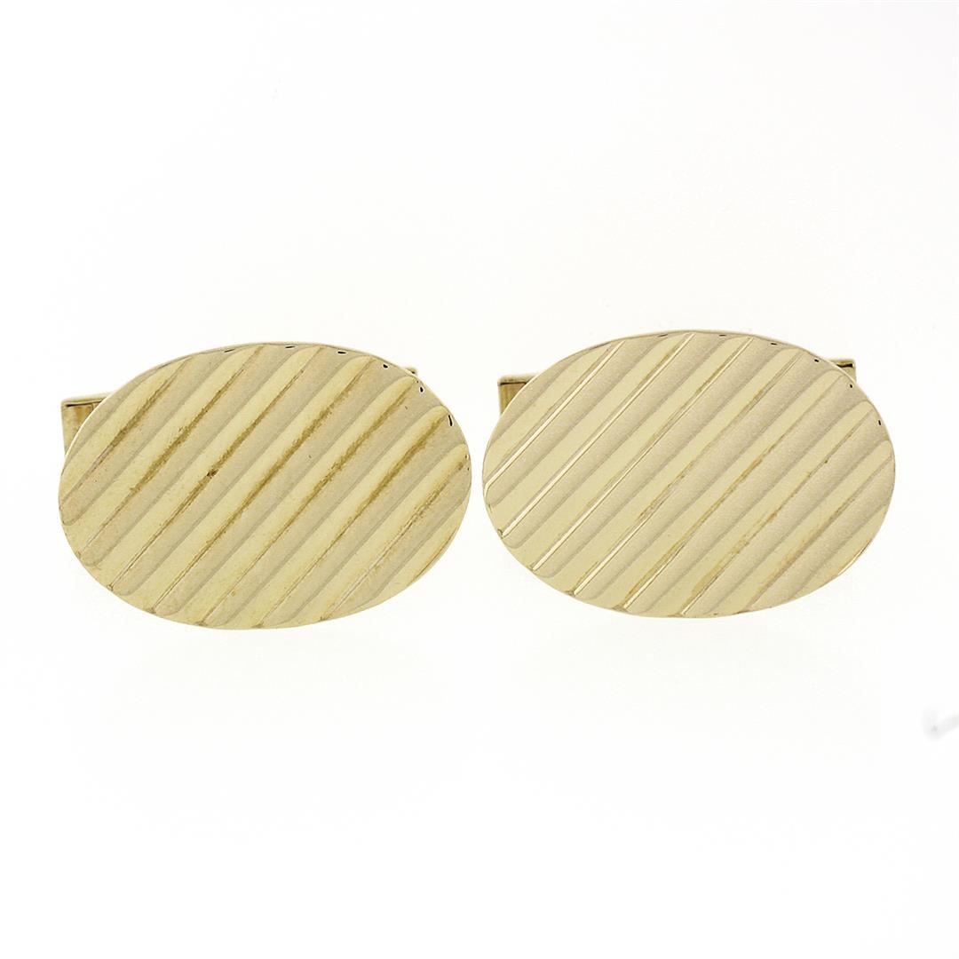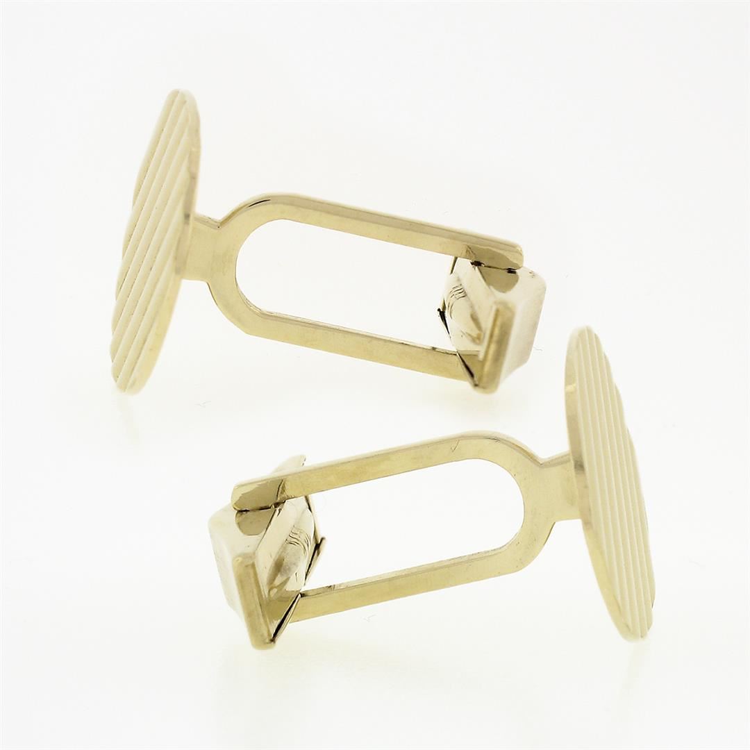 A vintage solid 14k yellow gold oval shape grooved cufflinks. These cuff links have a swivel design with a clearance of 13.8mm, weigh a total of 6.32 grams, and the front panels measure 19.2x13.6mm.