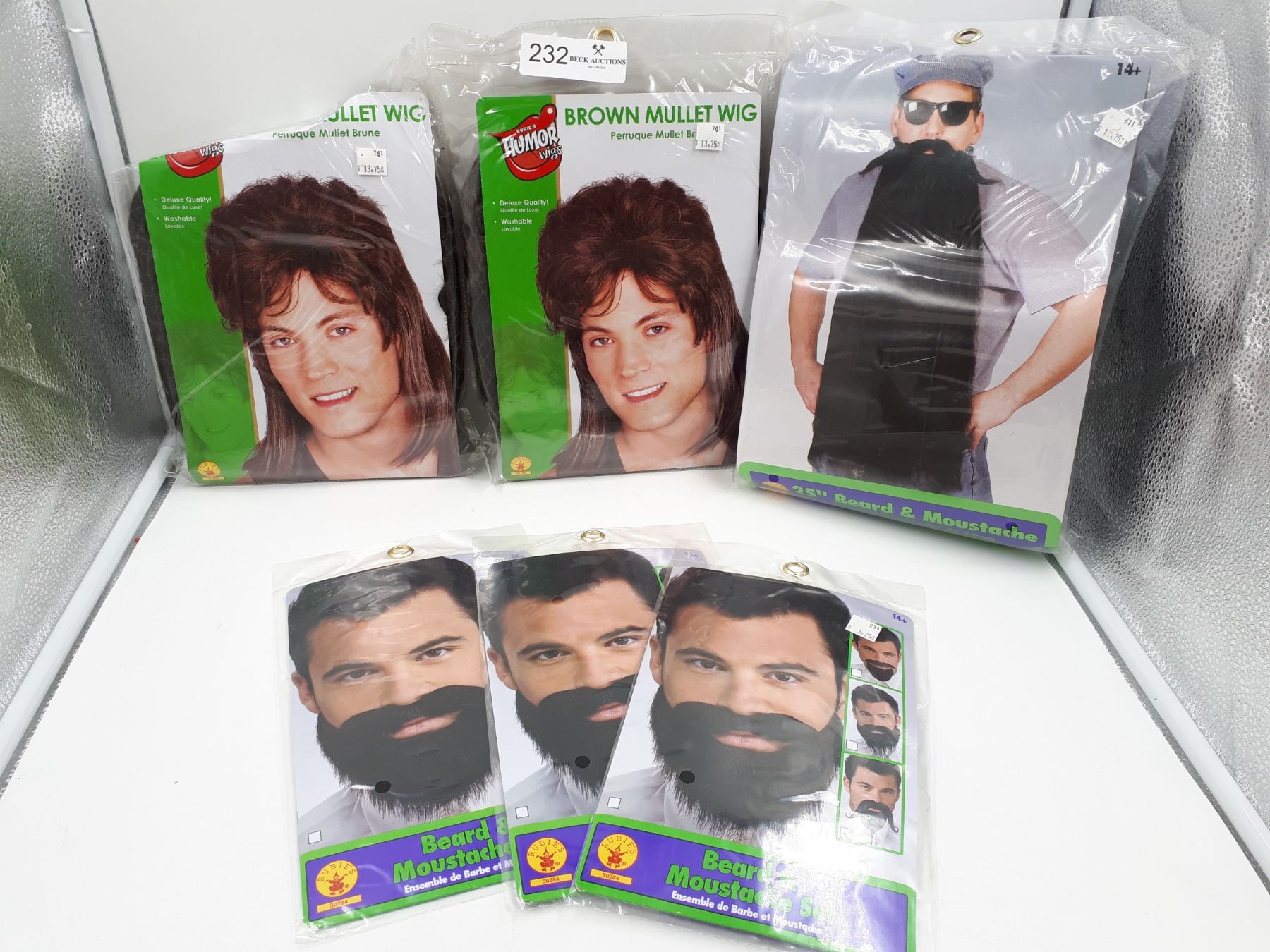 Lot consisting of 2 x mullet wigs, 1 x long duck dynasty beard, and 3 x regular beards. all new in package.
