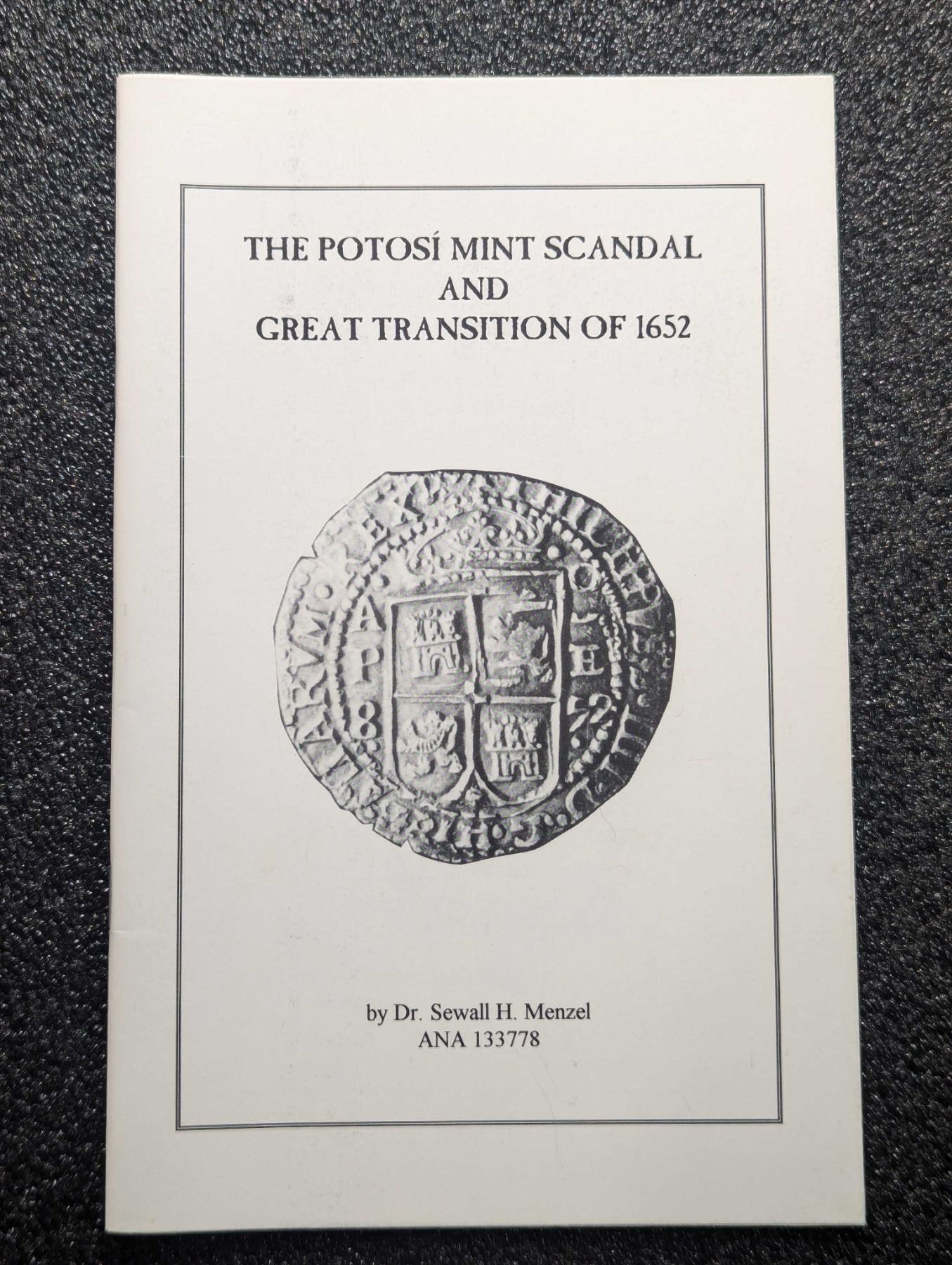 Menzel, Sewall H. Ph.D. THE POTOSI MINT SCANDAL AND GREAT TRANSITION OF 1652. En Rada Publications, West Palm Beach. 1995. 12mo. 36 pages. original white printed card covers. Line illustrations. b&w coin photos throughout. English text. The David Baker Library. Fine. This book is a detailed history of the Potos mint scandal where coins were minted with a low percentage of silver than what was the standard for the time. It also goes into detail on the transition of 1652 where the design on cobs changed. The book includes illustrations of the countermarks and design changes of the coins as well as several actual coin photos. Lot weight: 0 lbs 3oz. Subject(s): Spanish American Coinage.