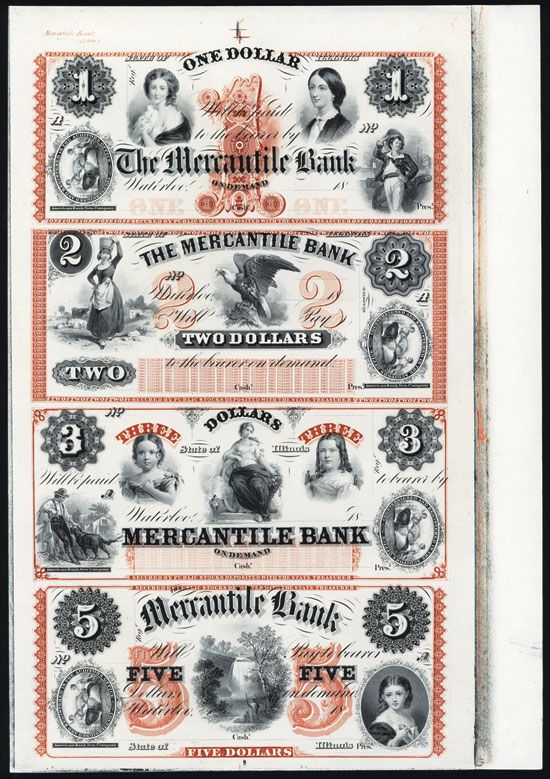 Waterloo, Illinois, Uncut sheet of 4 notes, ND (originally printed ca. 1850-60's, these are ca.1960-70's), $1-$2-$3-$5, (All Haxby Unlisted as well as unlisted location ÒWaterlooÓ), Haxby has no mention of any notes from Waterloo or with ÒThe Mercantile BankÓ title or designs, evidently they are all Unknown notes, Modern ÒProprietary Proof SheetÓ, The $1 note has sailor on LR, young woman with bird on left of large red central numeral Ò1Ó and portrait of another young woman on right of numeral and state seal on LL; The $2 note has central Screaming Eagle with woman holding basket on head on UL and state seal on LR; The $3 note has man petting dog on LL, Seated allegorical plenty with cornucopia in middle flanked by two young girls, state seal LR; The $5 note has young girl holding piece of fruit on LR, Native Americans looking at lovely waterfall scene flanked by red numeral Ò5'sÓ with state seal on LL, Amazing sheet and in addition there is an error of being off register between the black portion and the red colored border and underprints approximately 1/4th of an inch too low for the underprint, Black printing with red underprint printed on thin white card, CU to Gem Uncirculated condition. ABNC. (ABN Commemoratives, AIA XI, May 15, 2012)