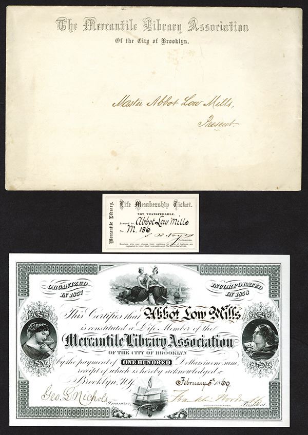 Brooklyn, N.Y., 1869, $100 Issued Life Membership certificate, Issued to Abbot low Mills, signed by Franklin Woodruff as president and George Nichols as Treasurer, Black with no underprint, Allegorical women at top with women on left and right, book with liberty cap on bottom, Includes envelope, protective paper and a life membership card. XF condition. Rare issued, ABNC.