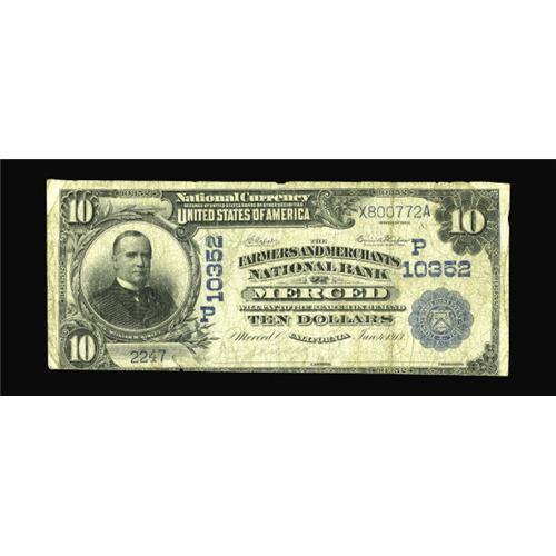 <B>Merced, CA</B></I> - $10 1902 Date Back Fr. 621 <B>The Farmers & Merchants NB</B></I> Ch. # (P)10352<BR>Despite the increasing focus on Nationals as a result of steadily rising prices, this <B>Very Good</B></I> note remains the only Date Back yet to be discovered from here. As such, it will likely see highly competitive bidding from multiple sources and should sell for no less than...