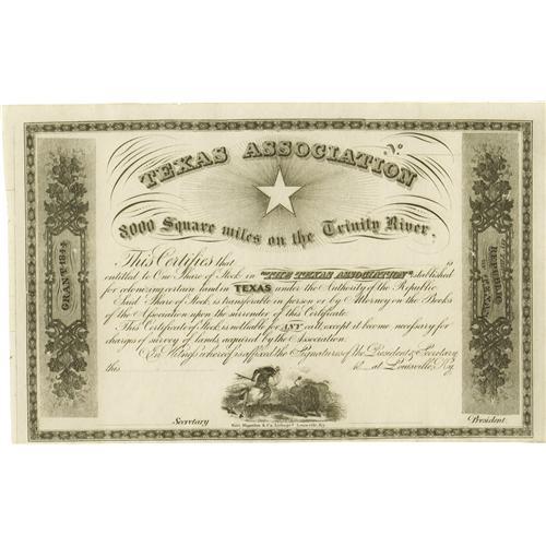 <B>[Mercer Colony]. Texas Association 8,000 Square Miles on the Trinity River</B></I>… Louisville: Hart, Mapother & Co., 1844. Lithographed stock certificate. 16.4 x 25.6 cm. Very fine copy. First edition. Unrecorded by the bibliographer Thomas W. Streeter who lists similar items, as well as other imprints relating to the Texas Association colony. The Texas Association was formed by Charles F. Mercer, former agent for Peter's Colony, received his grant from Sam Houston in January, 1844. Mercer financed his colonization contract by "dividing his whole interest in the said contract of land …into one hundred shares." This certificate grants "One Share of Stock in the Texas Association established for colonizing certain land in Texas under the Authority of the Republic." <I>Courtesy of Michael Heaston, Austin.</B></I> <BR><BR><b>This 2006 March Texas State Historical Association Charity Auction is being held in Austin, TX on February 12 - March 4, 2006. This is a charity auction. All proceeds from donated lots in the auction, commissions from consigned lots, and the buyer's premium go solely to the Texas State Historical Association. The floor auction session is by invitation only. Online bidding ends March 3, 2006 at 10:00PM CT. Your secret maximum bid will compete for you during the floor auction, and it is possible that you may be outbid on the floor after internet bidding closes. The applicable buyer's premium for this auction is an amount equal to 15% (minimum $9 per lot) of the successful bid on ebay. State law requires lots consigned (not donated) to THSA collect full sales tax on items that sell for a total of $5,000 or more. </b>