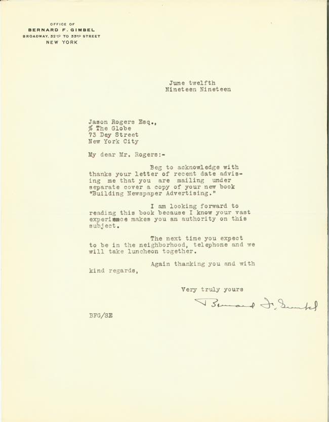 BERNARD GIMBEL. TLS. 1pp. 8 1/2" x 10 1/2". New York. June 12, 1919. A typed letter signed "Bernard F. Gimbel" on his personal letterhead. The businessman wrote to "Jason Rogers Esq., c/o The Globe": "Beg to acknowledge with thanks your letter of recent date advising me that you are mailing under separate cover a copy of your new book 'Building Newspaper Advertising.' I am looking forward to reading this book because I know your vast experience makes you an authority on this subject. The next time you expect to be in the neighborhood, telephone and we will take luncheon together." The letter is in very fine condition.