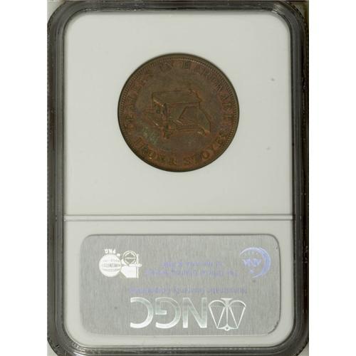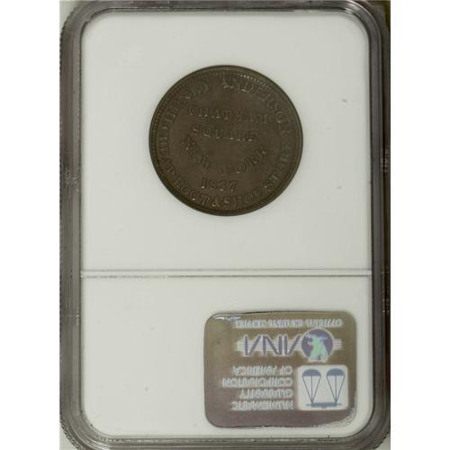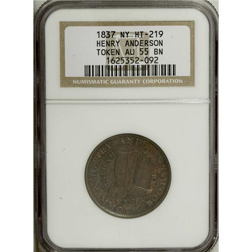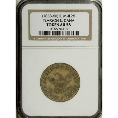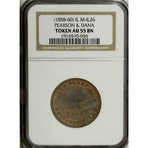 <B>Merchant Token Lot.</B></I> Consists of: an <B>1837 Henry Anderson, New York, NY, HT-219, R.2, AU55 NGC,</B></I> copper, a pleasing Choice AU token from this CHEAP BOOT & SHOE STORE; an <B>1856 John Plane & Co., Belvidere, IL, Miller-IL-2, AU55 NGC,</B></I> copper, much mint red remains, incorrectly cataloged by NGC as Miller-IL-26; and an <B>(1858-60) Pearson & Dana, Chicago, IL, AU58 NGC,</B></I> brass, plain edge, lustrous with a spot on the eagle's left wing. Current market value is about $200-$225.<BR><BR><b>Shipping:</b> Coin/Currency (<a target="_blank" href="http://www.heritageauctions.com/common/shipping.php">view shipping information</a>)