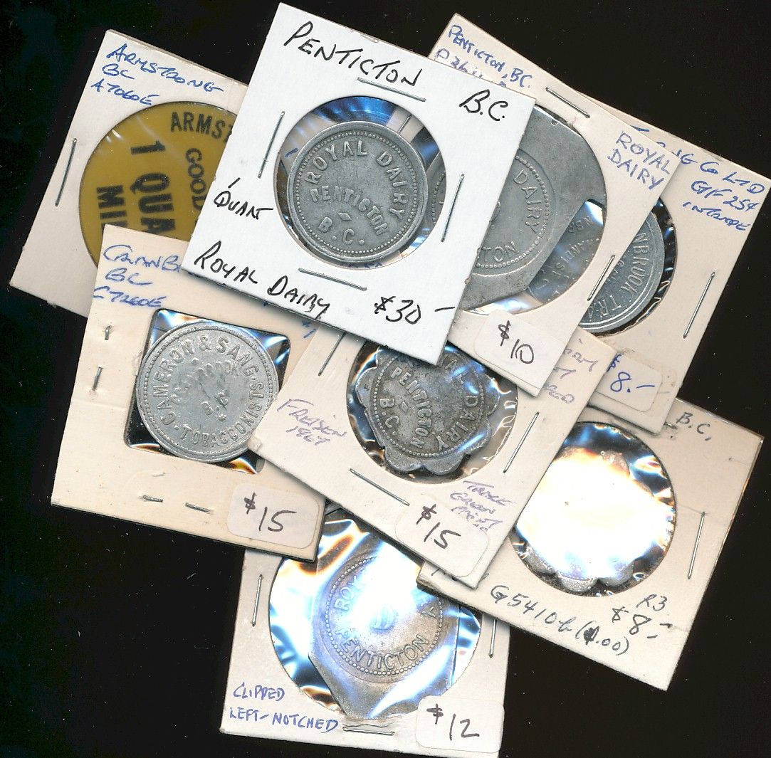 Merchant Tokens Lot; includes issues from BC, Manitoba & Quebec. Lot of 229 pcs all in 2x2's and identified.