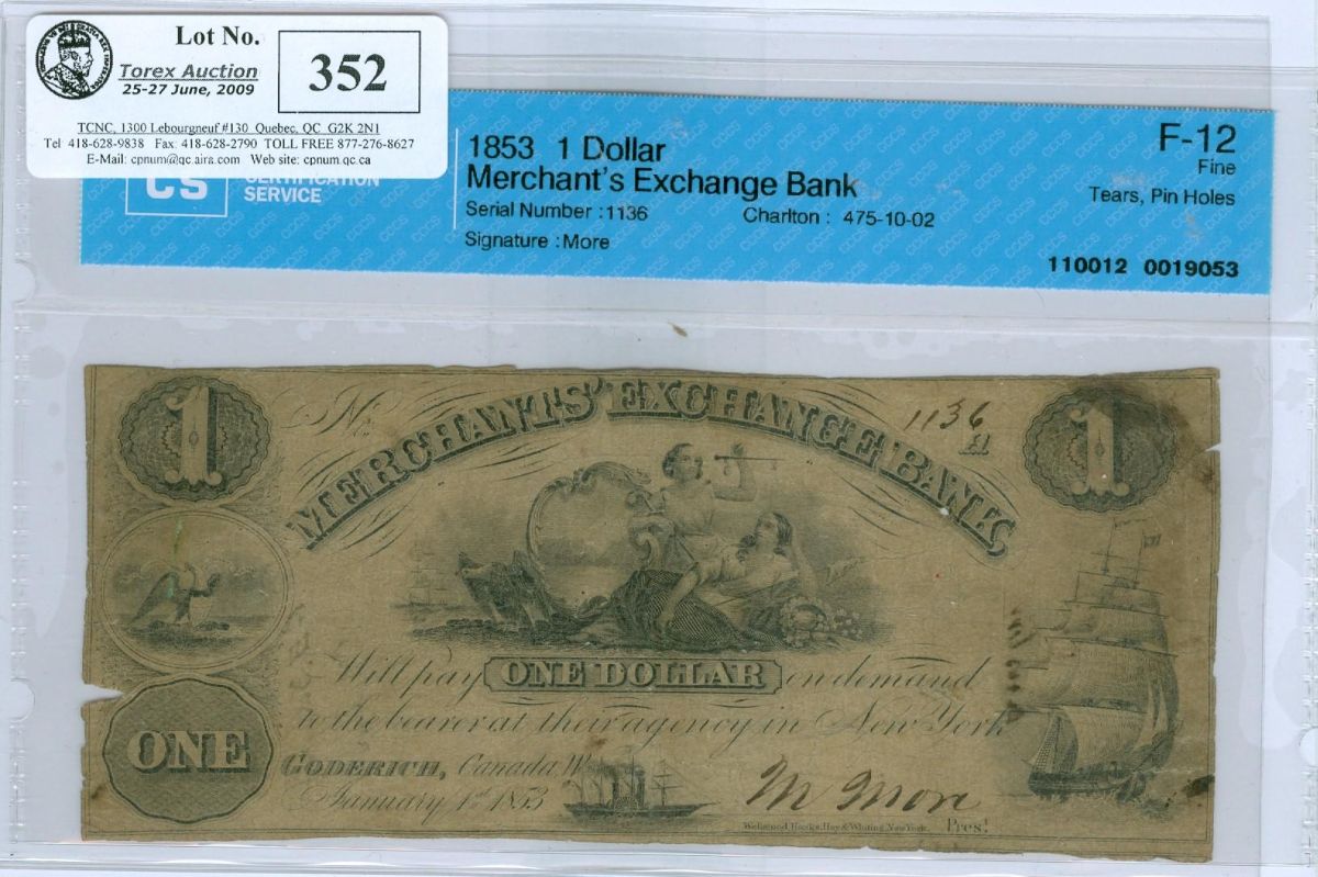 Merchant's Exchange Bank 1853 $1 #1136 CH-475-10-02 The note would grade F12 but with pinholes and minor tears. This is the actual Charlton plate note. The very first example ever seen and handled by TCNC.