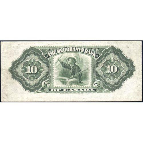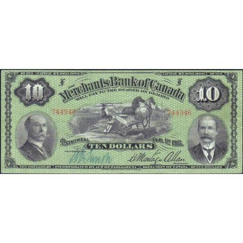 The Merchants Bank of Canada Ten Dollars 1916, CH 460-18-04 Serial Number 744946 F, VF-EF. Off centre toward the top