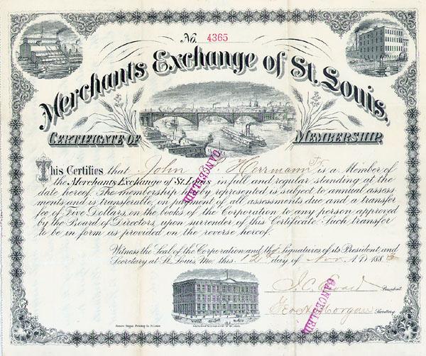 1890, Missouri. Black/White. Certificate of Membership. Vignette of ships, river and bridge at top center and building at bottom center. Stamp cancelled. Very fine.