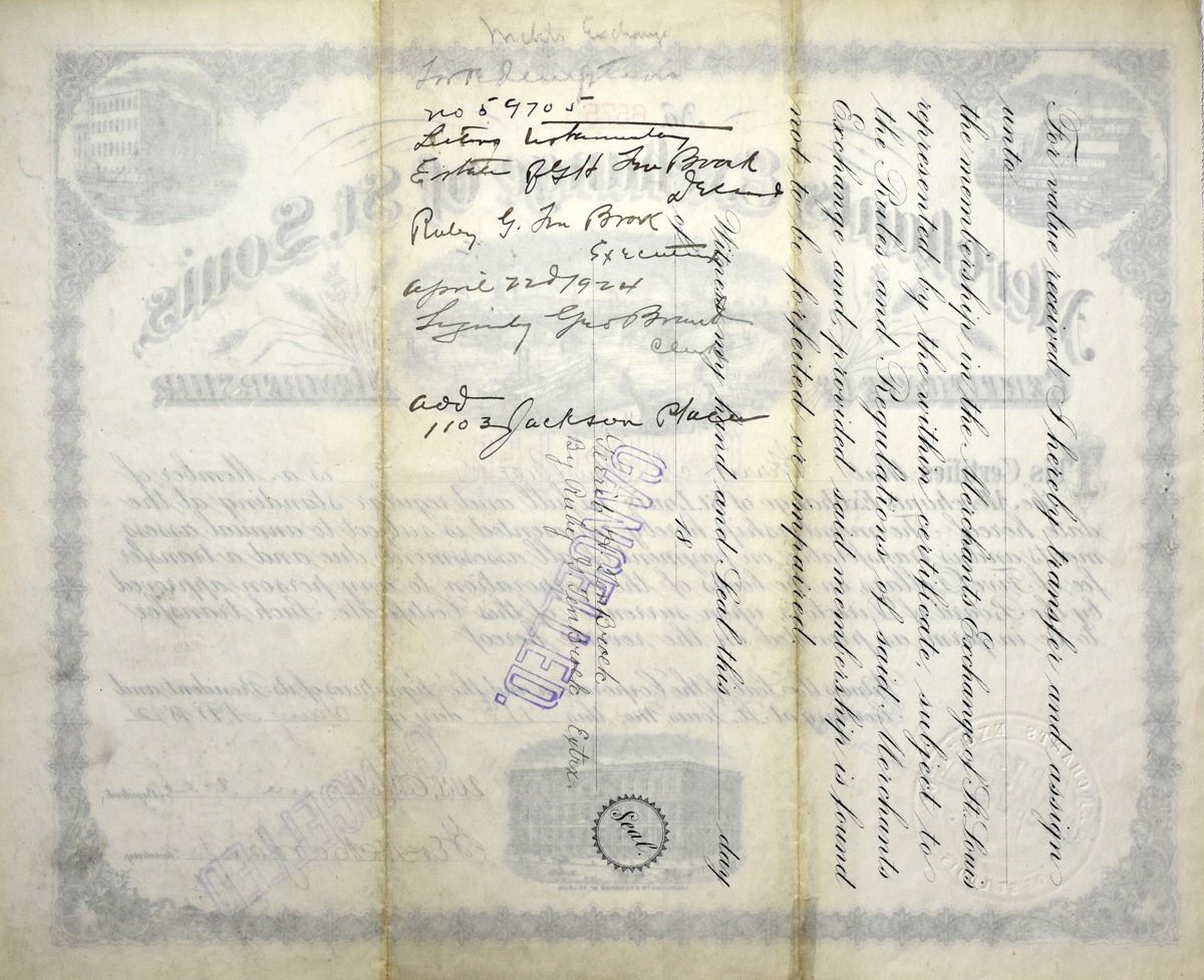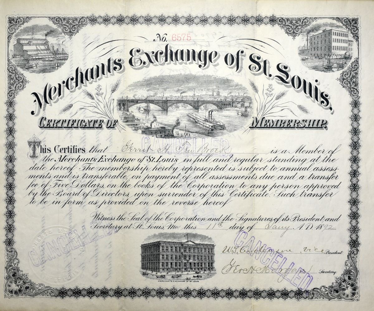 Merchants Exchange of St. Louis Certificate of membership. 1892. About Uncirculated. Cancelled. No. 6575. Stamp cancelled. Embossed seal at lower left. Printed on Crane & Co. watermarked paper. Hand dated 11th January 1892. Very scarce. Has beautifully engraved vignette of EADS Bridge.