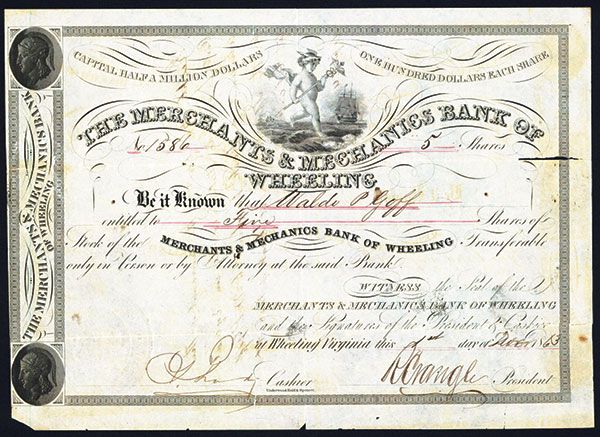 West Virginia, 1863, 5 Shares, Issued and Uncancelled Stock, #1586, Cherub running on water top center with galleon behind, Fine condition with rip on right side, Underwood, Bald & Spencer.