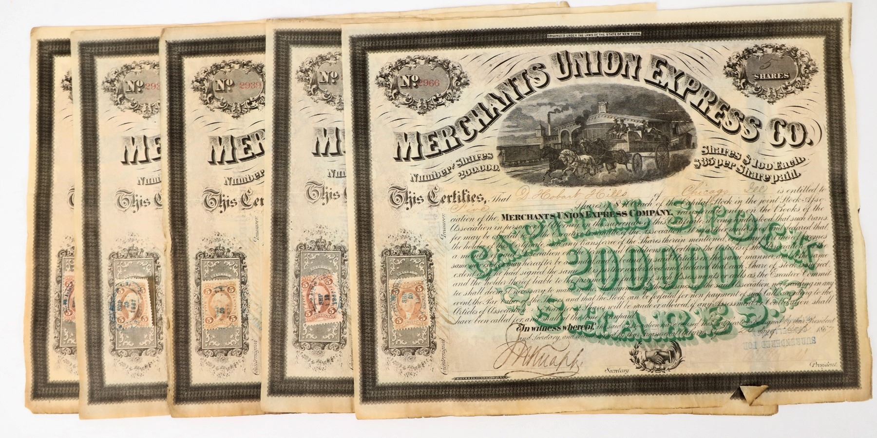 Lot of 5 stocks issued in 1867. All signed by Knapp and Ross. This was the competitor to American Express Company. Eventually the two merged to form American Merchants Union Express Company. Nice wagon vignettes. Toning, wrinkles.