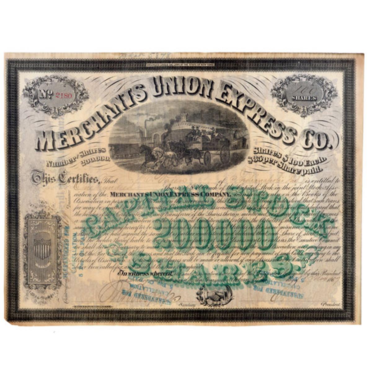 1867, New York. Stock certificate for 100 shares. Black with green underprint. Vignette at upper center of a charging team of horses drawing a Merchants Union Express wagon loaded with parcels. Litho. Stamp cancelled. Overall age toning and rounded lower left corner. Fine.