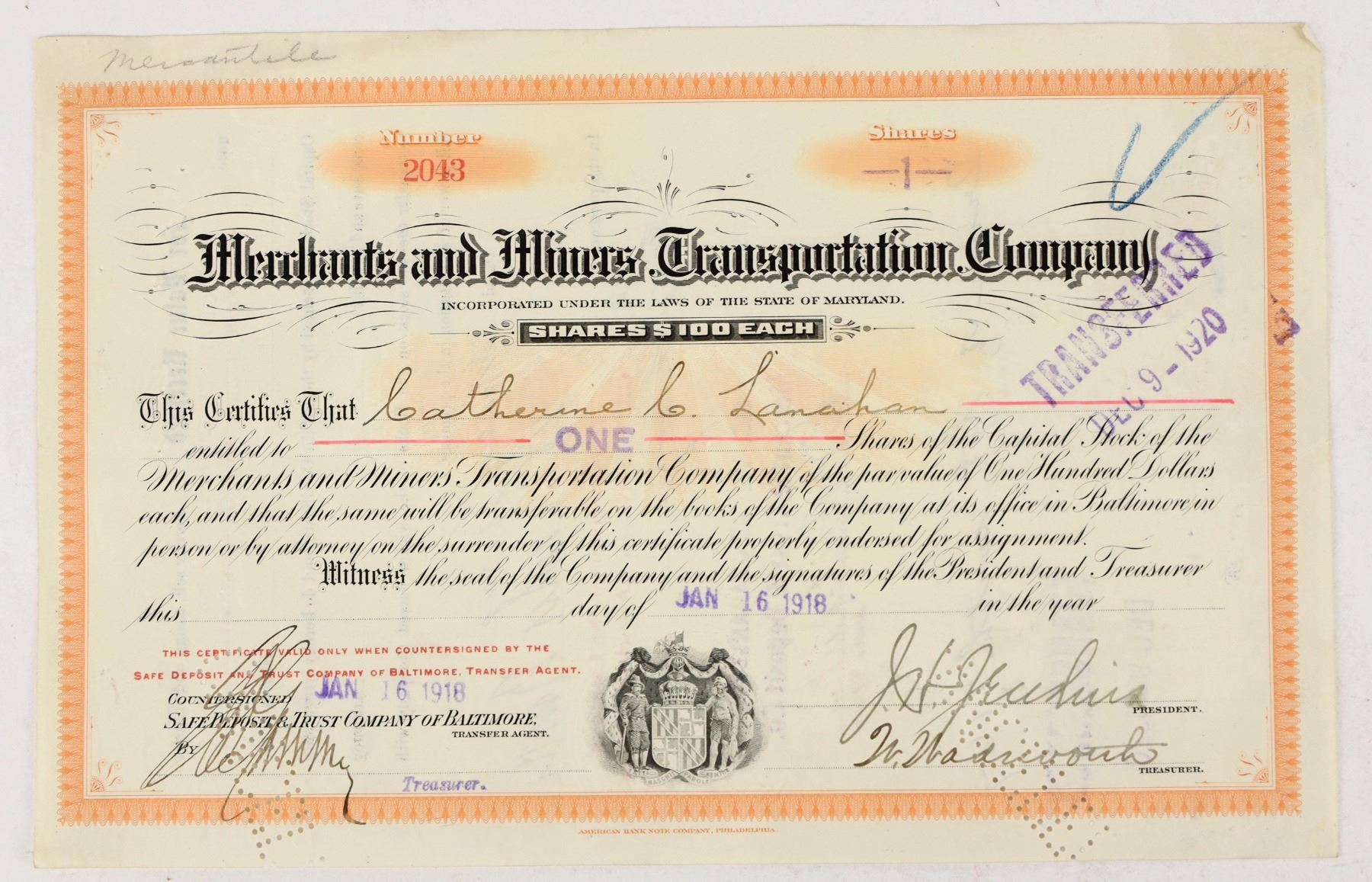 Issued in 1918 for one share, stamp and punch cancelled. The Merchants and Miners Transportation Company was a prominent American steamship line founded in 1852 to provide reliable coastal freight and passenger service between major Atlantic ports such as Baltimore, Savannah, Boston, and Providence. Known for its fleet of sturdy iron and later steel steamers, the company played a major role in linking East Coast commercial centers, especially during periods of industrial expansion and wartime demand. It continued operating into the early 20th century before eventually being absorbed into larger transportation networks as coastal steamship travel declined.