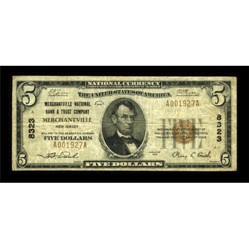 <B>Merchantville, NJ</B></I> - $5 1929 Ty. 1 <B>Merchantville NB & TC</B></I> Ch. # 8323<BR> An elusive note from a bank which has realized over $1000 in every recent auction appearance. Nice <B>Fine</B></I> or a bit better.<BR><I>From The John Ameen Collection</B></I><BR><BR><b>Shipping:</b> Coins & Currency (<a target="_blank" href="http://www.heritageauctions.com/common/shipping.php">view shipping information</a>)