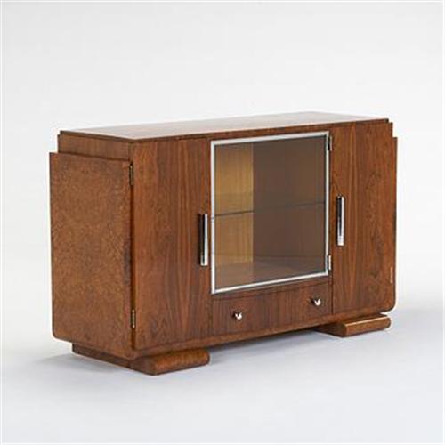 Mercier Freres buffet France, c. 1940 walnut, walnut burl, chrome-plated steel, glass 53.75 w x 19.5 d x 33 h inches Signed with applied metal manufacturer's label to interior drawer: [Mercier Freres Paris].