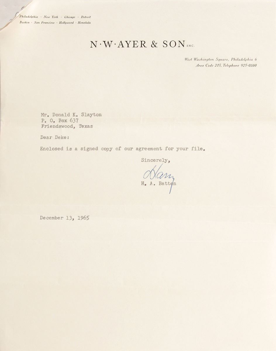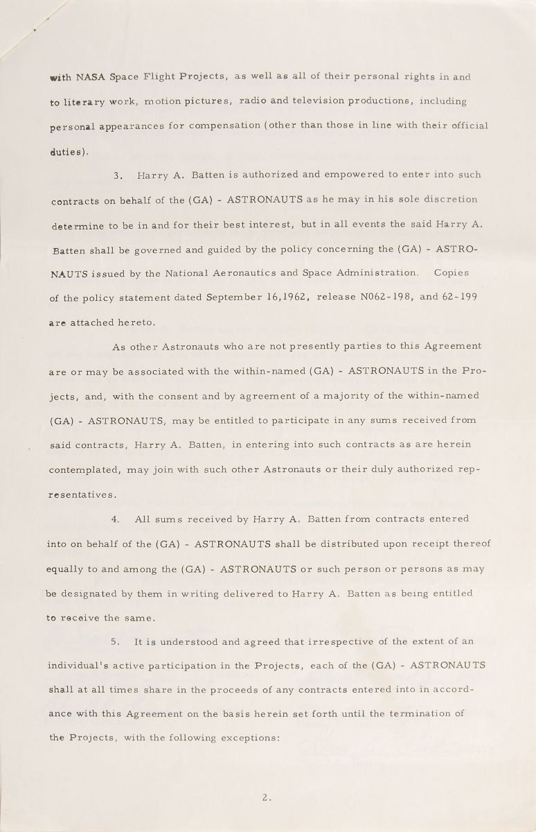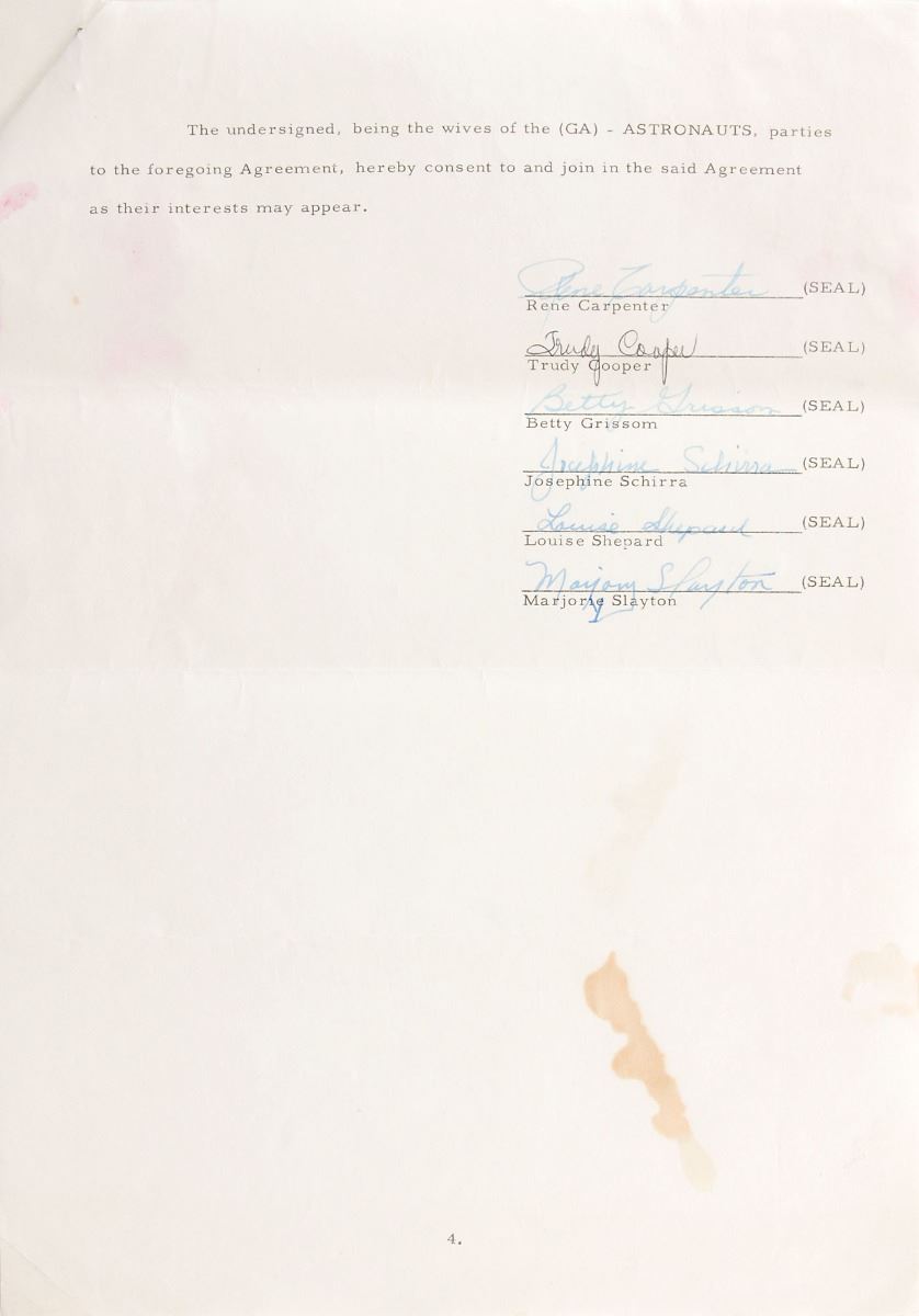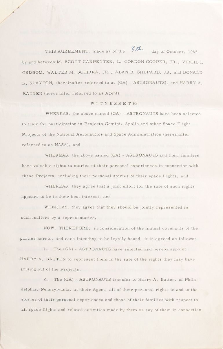 DS, four pages, 8.5 x 13, October 8, 1965. Contract in which Scott Carpenter, Gordon Cooper, Gus Grissom, Wally Schirra, Alan Shepard, and Deke Slayton agree to “appoint Harry A. Batten to represent them in the sale of the rights they may have arising” from Gemini, Apollo, and other space projects. Signed at the bottom of the third page in black ink or felt tip, “M. Scott Carpenter,” “Leroy S. Cooper, Jr.,” “Virgil I. Grissom,” “Walter M. Schirra, Jr.,” “Alan B. Shepard, Jr.,” and “D. K. Slayton,” and countersigned in blue ballpoint by Batten. The final page of the contract is signed in blue or black ink by the wives of the six referenced astronauts, and a transmittal letter forwarding the agreement is stapled to the front page of the document. In fine condition. Akin to Leo De Orsey and the Mercury Project, Philadelphian lawyer and advertising man Harry Batten represented astronauts from NASA’s lauded second group, the New Nine, hand-selected for the upcoming Gemini program. And again like De Orsey, Batten helped the new astronauts land a major publishing deal with Life Magazine soon thereafter. An historic, immensely appealing cast of early signatures.