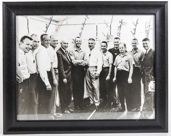 Mercury 7 Autographs on Early Nasa Photo. All seven astronauts signed this original NASA photo. Carpenter, Glenn, Shepard, Grissom, Slayton, Cooper and Schirra. Other members of the early NASA team are shown including Walt Williams, Center Director and Shorty Powers, Public Affairs Officer. Some slight fading but overall a very nice and uncommon item.