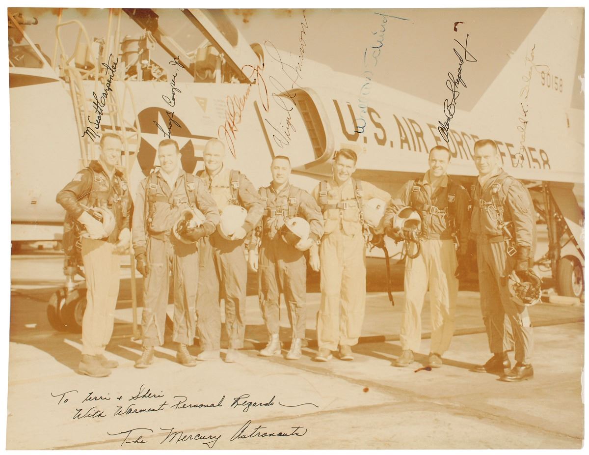 Vintage glossy 13 x 10 photo of the original seven Mercury astronauts posing in front of a US Air Force jet, signed above their respective images in various ink types, “M. Scott Carpenter,” “Leroy G. Cooper, Jr.,” “J. H. Glenn, Jr.,” “Virgil I. Grissom,” “Walter M. Schirra,” “Donald K. Slayton,” and “Alan B. Shepard.” An inscription, “To Terri & Sheri, With Warmest personal Regards—The Mercury Astronauts,” has been added by Carpenter. Reverse bears an ownership notation. In very good condition, with uniform overall fading, light dampstaining to top edge, scattered creasing, a bit of emulsion loss to extreme right edge, and the Slayton signature a shade light and irregular ink adhesion to the Schirra signature. Taken at Langley Air Force Base on January 20, 1961, the day of John F. Kennedy’s inauguration, this photograph pictures the seven original test pilots chosen from a field of hundreds eager to become America’s first astronauts. The inscription of Terri and Sheri refers to the seven-year-old twin daughters of Joe Garino, the physical trainer for the astronauts of the Mercury, Gemini, and Apollo programs. Given its association with NASA’s longtime fitness trainer, this is a remarkable fully signed photo further enhanced by its cast of early signatures and atypically large size.