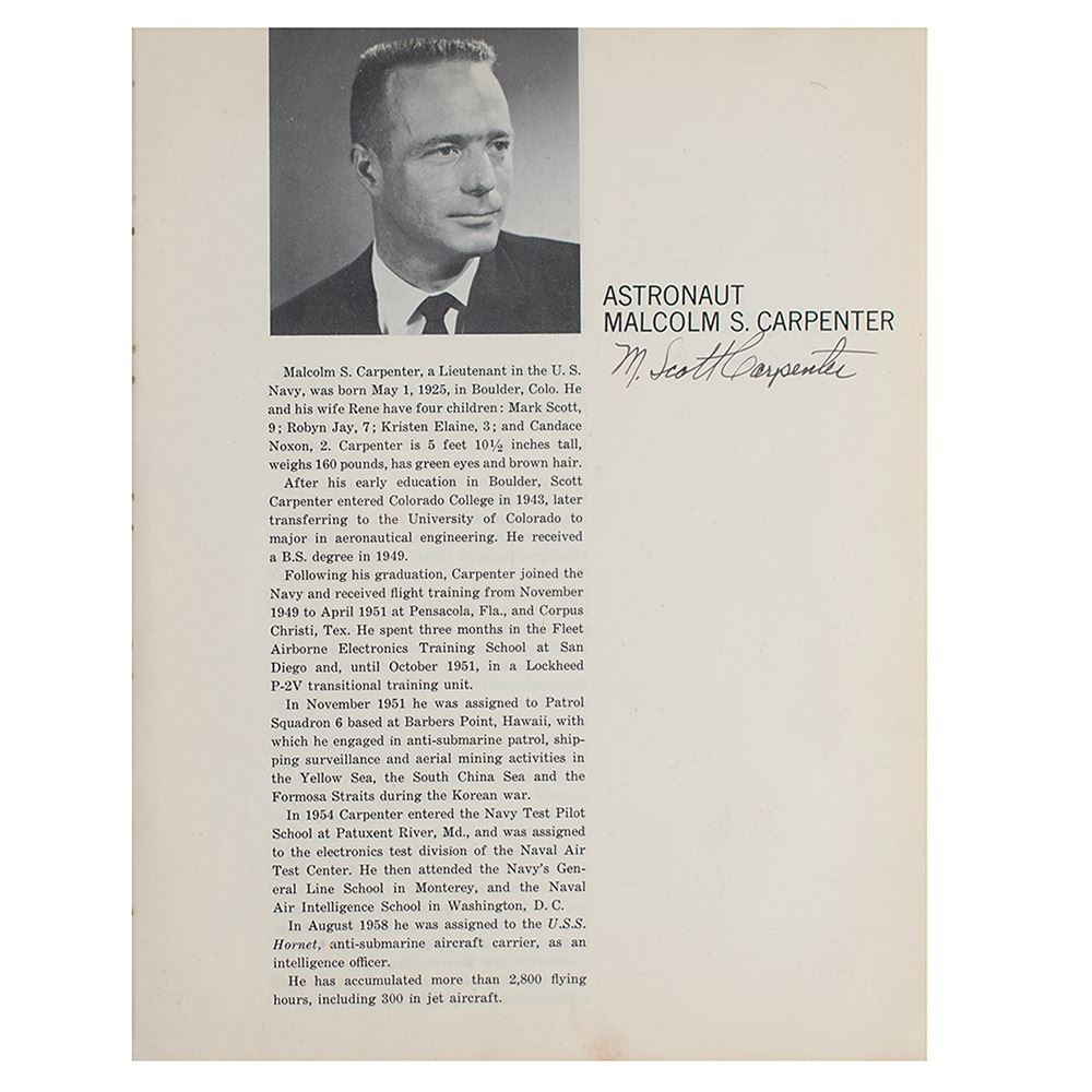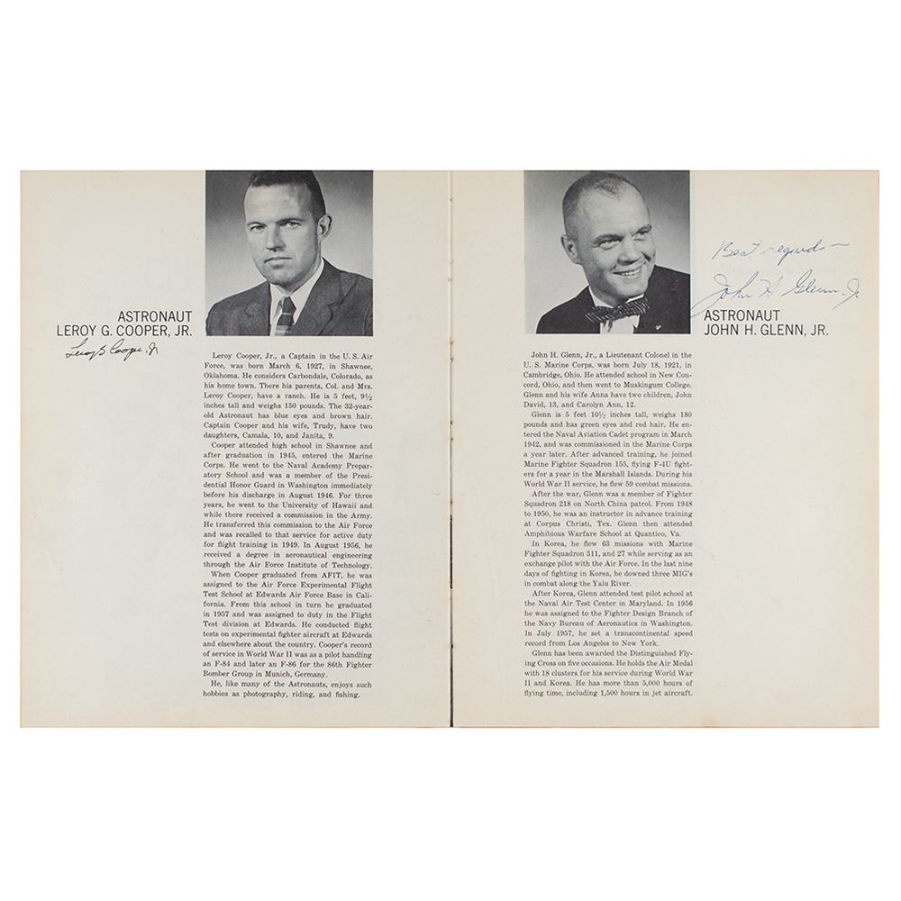Sought-after signed book: The Astronauts by Don Myrus. First edition. NY: Rutledge Books / Grosset & Dunlap, 1961. Hardcover, 8.5 x 11.25, 92 pages. Signed in ink and ballpoint on their respective biography pages at the close of the book, "M. Scott Carpenter," "Leroy G. Cooper, Jr.," "Best regards—John H. Glenn, Jr.," "Virgil I. Grissom," "Walter M. Schirra, Jr.," "Alan B. Shepard, Jr.," and "Donald K. Slayton." In very good to fine condition, with wear to the covers, heavy damage to the partly missing spine; interior pages are all clean and unaffected.