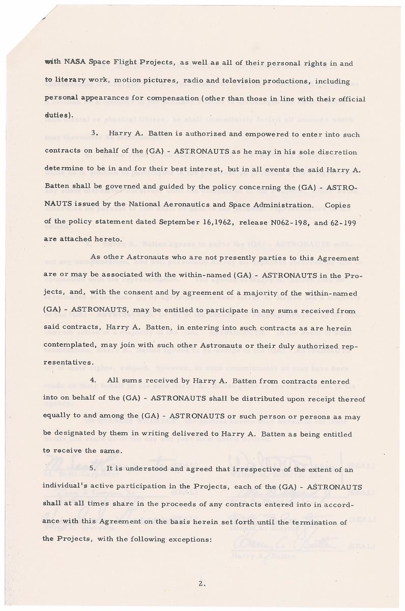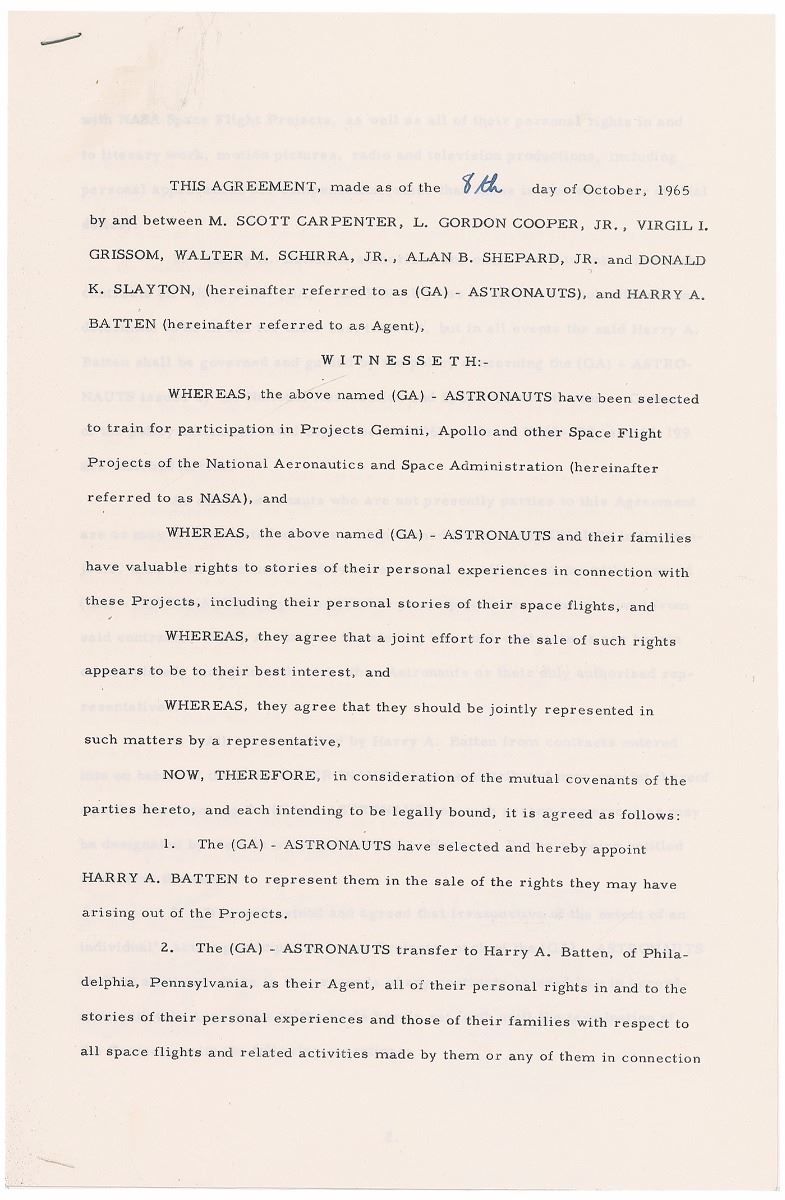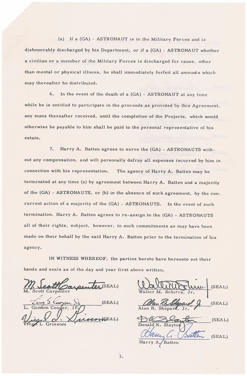 DS, signed “M. Scott Carpenter,” “Leroy G. Cooper, Jr.,” “Virgil I. Grissom,” “Walter M. Schirra, Jr.,” “Alan B. Shepard, Jr.,” and “D. K. Slayton,” four pages, 8.5 x 13, October 8, 1965. Agreement between six of the Mercury Seven astronauts (John Glenn having received his own contract) in which they elect to have Harry A. Batten represent them as their agent. In part: “Whereas the above named…Astronauts have been selected to train for participation in Projects Gemini, Apollo and other Space Flight Projects of the National Aeronautics and Space Administration (hereinafter referred to as NASA), and…[the] Astronauts and their families have valuable rights to stories of their personal experiences in connection with these Projects, including their personal stories of their space flights…[the] Astronauts have selected and hereby appoint Harry A. Batten to represent them in the sale of the rights they may have arising out of the projects.” Also signed by Batten and the wives of the six astronauts. In fine condition, with expected document wear. Even two years after the end of the Mercury program, public interest continued to be very high for these new heroes, each of whom would go on to write at least one book about his own experiences.